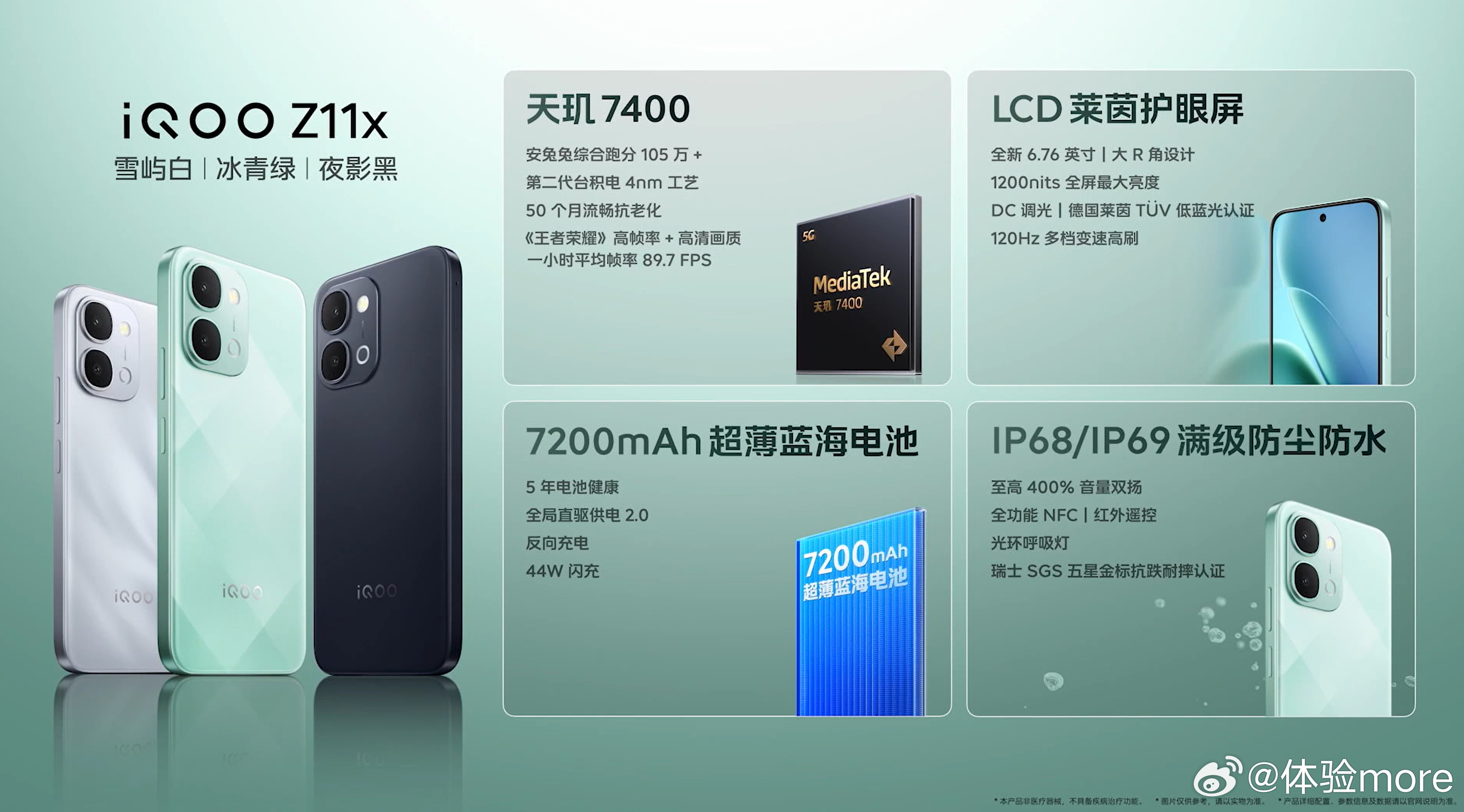 6.76英寸1080p 120Hz LCD,天玑7400+LPDDR4X+ UFS 3.1,后置50MP,44W+7200mAh,塑料中框、侧边指纹、双扬、IP69/68等等。iQOO Z11