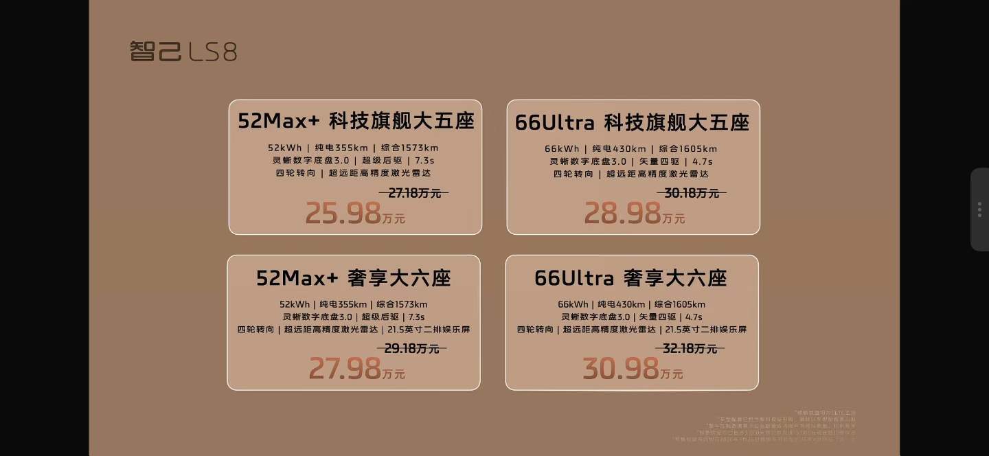刚才我以为智己的朋友打错价格了,智己LS8预售价25.98万?如果按照以往惯性,最终上市价格还有一定下探空间的话,岂不是能干到 25 万以内起步?