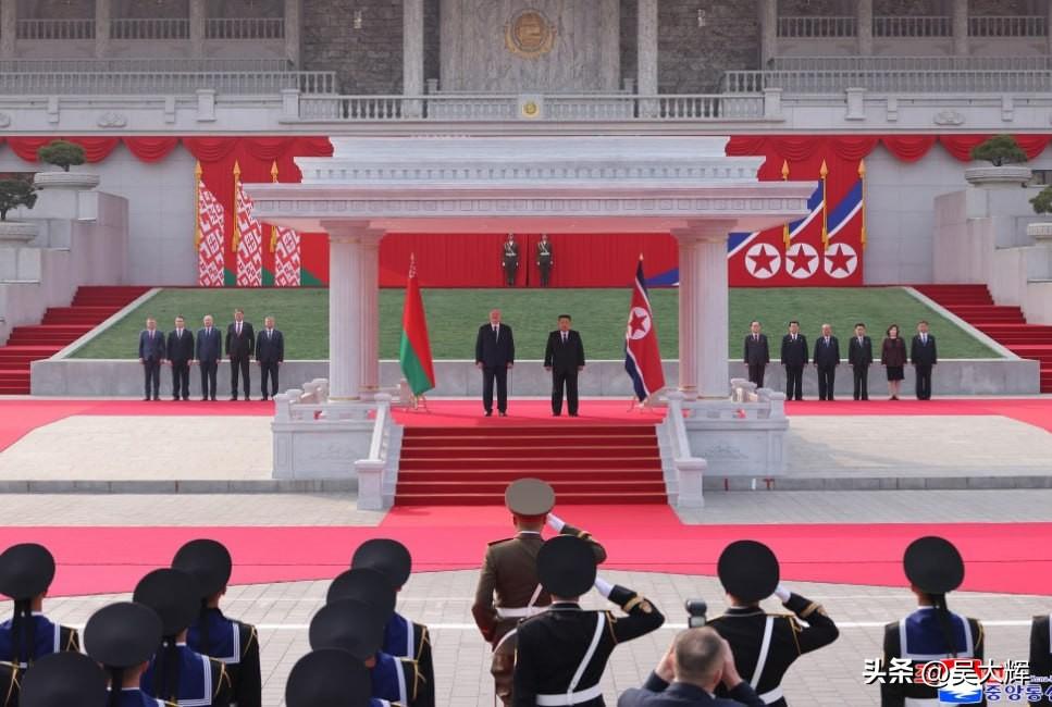 3月26日,平壤举行隆重仪式,欢迎对白俄罗斯总统亚历山大·卢卡申科到访朝鲜。金正恩亲自迎接白俄罗斯领导人。 朝鲜国家通讯社朝中社报道称,“仪式现场悬挂着朝鲜与白俄罗斯两国国旗,朝鲜人民军仪仗队与礼宾骑兵列队就位,国防部中央军乐团也参与了仪式。”