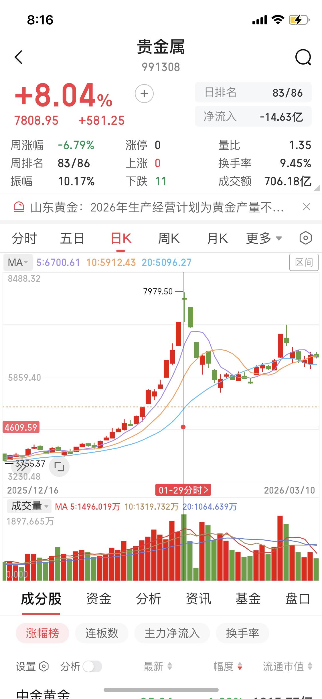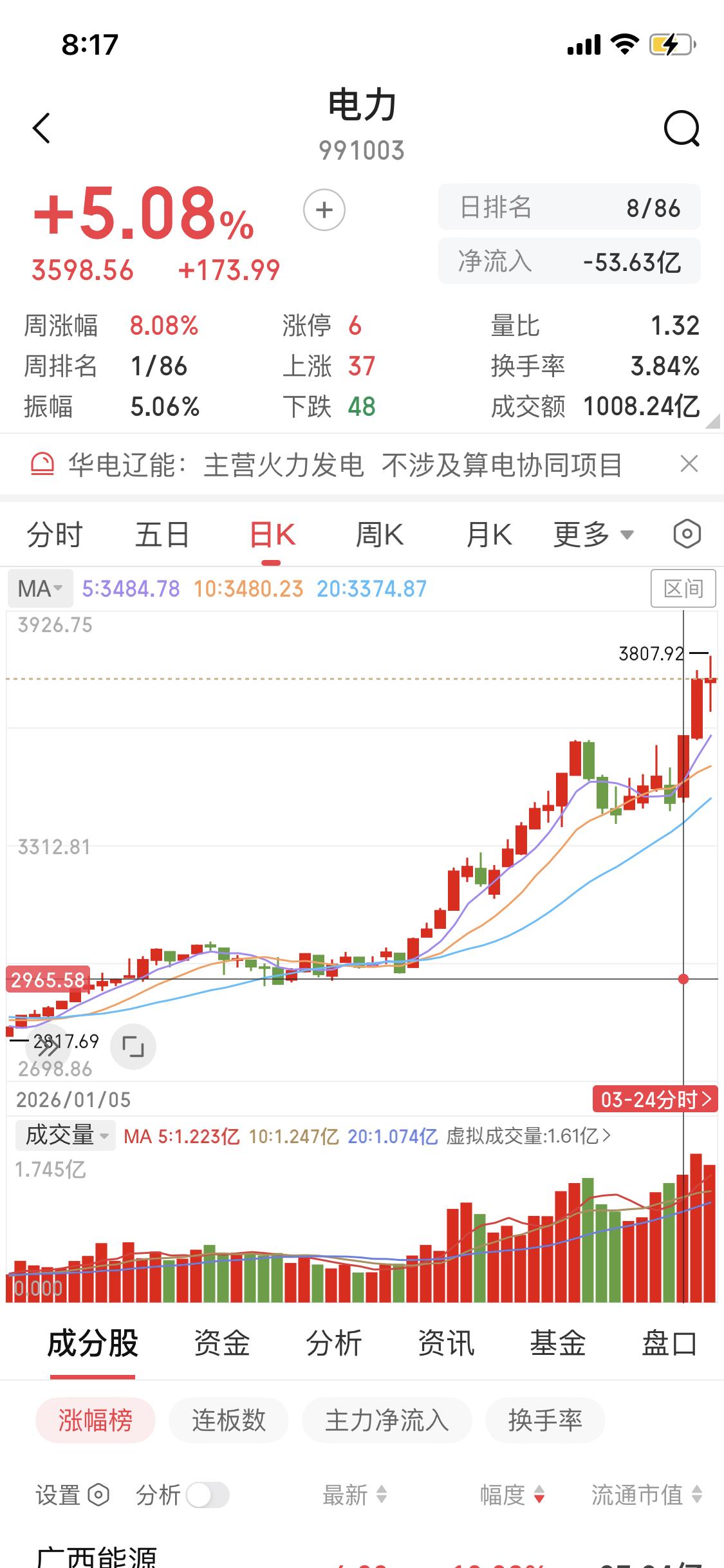 电力板块这波行情感觉还远没到尽头呢。就目前来看,它都还没走加速阶段,这意味着后续还有不少上升空间。明天我坚定看涨。 龙头华电辽能大概率会沿着5日线稳稳向上走趋势。而且明天板块可能会高切低。再看看商业航天和贵金属板块,商业航天整个板块涨了7个点,贵金属涨了8个点,相比之下,电力板块的涨幅明显还有很大潜力,加速阶段还没到来。所以我觉得电力板块后续还会有不错的表现,明天接着冲!