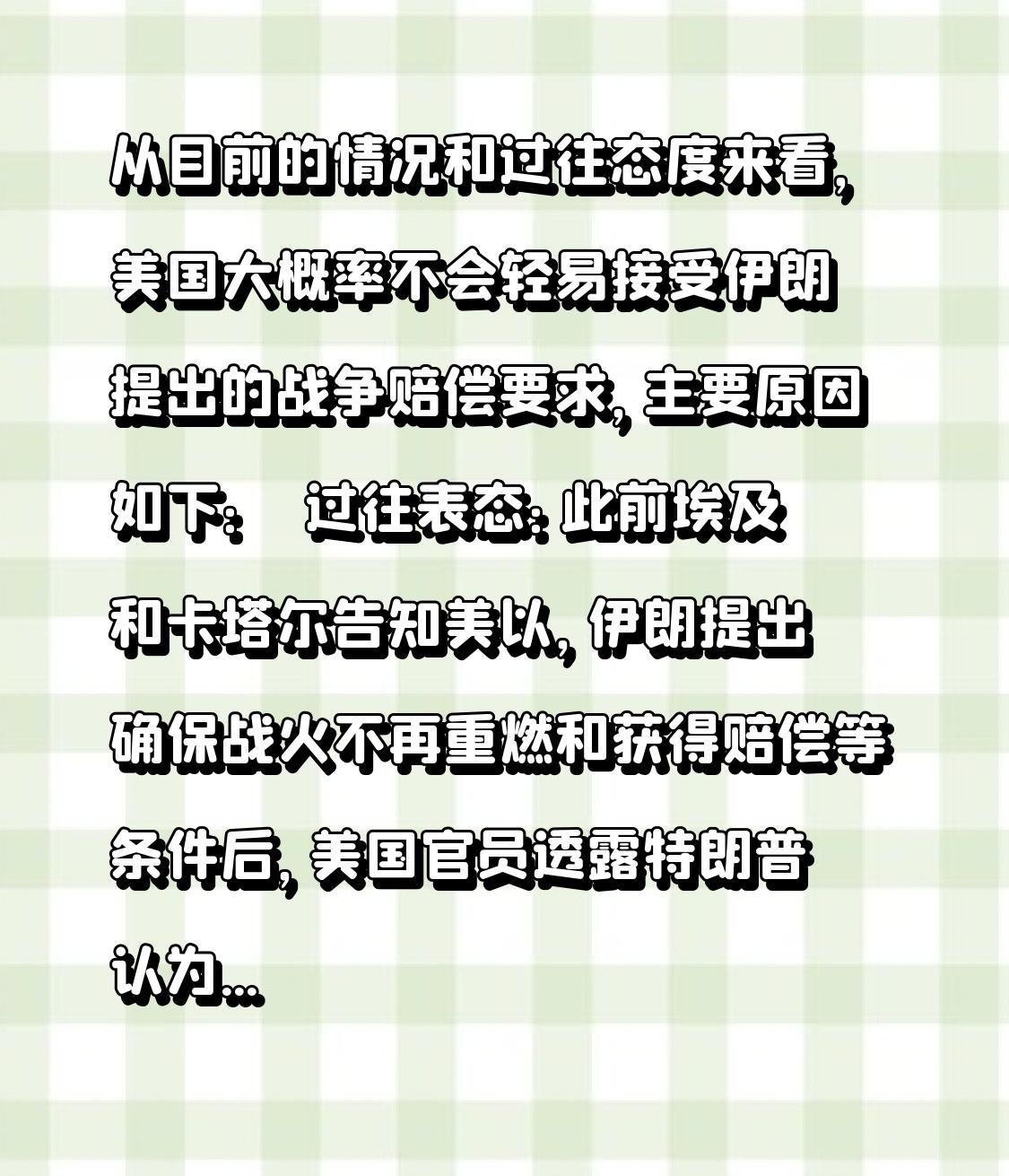 从目前的情况和过往态度来看,美国大概率不会轻易接受伊朗提出的战争赔偿要求,主要原因如下: ● 过往表态:此前埃及和卡塔尔告知美以,伊朗提出确保战火不再重燃和获得赔偿等条件后,美国官员透露特朗普认为伊朗所提赔偿要求“行不通” ,这显示出美国对伊朗赔偿要求的抵触态度。 ● 利益考量:若接受赔偿要求,意味着美国要承担巨大的经济损失。据估算,伊朗直接经济损失约200 - 350亿美元,间接经济损失约350 - 500亿美元,若加上未来长期重建成本,可能突破1000亿美元,这对于美国而言是沉重的负担。而且,接受赔偿要求也相当于承认自身在战争中的过错和责任,这不符合美国一贯的外交姿态和利益诉求。 ● 战争目的:美国发动或参与战争往往有其政治、经济和战略目的,如维护自身在中东地区的影响力、控制石油资源等。若接受赔偿要求,可能会被视为其战争行动的失败,这是美国难以接受的。 不过,国际局势复杂多变,如果战争局势朝着对美国极为不利的方向发展,或者国际社会给予美国强大的舆论压力,美国也有可能在赔偿问题上做出一定的妥协和让步。