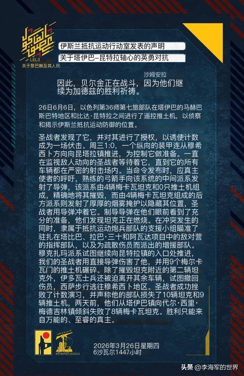 三天两次,以军遭真主党伏击,18辆坦克,两辆D9推土机被摧毁,以军伤亡情况不明。 25日,真主党在泰贝赫-坎塔拉方向上引诱伏击了一整个以色列装甲连队,10辆梅卡瓦坦克,两辆D9推土机,被真主党全部摧毁,这支以军装甲连队全军覆没。 真主党用的战术其实并没有多高明,就是常见的诱敌深入,把以军部队全放进来再打。 先放过以军的先头部队(侦察兵),然后等以军大部队全部进入,用导弹先打掉以军中间坦克,把以军连队一分为二,让其首尾不能兼顾,最终被全歼。 而这已是三天内的第二次。两天前,真主党在泰贝赫至代尔西尔扬公路用同样的方法,伏击摧毁了以军八辆梅卡瓦坦克。 也就是说真主党在三天内摧毁了以军18辆梅卡瓦坦克。 真主党要是照这个速度打下去,以色列的梅卡瓦坦克也就只够几个月用。 这么多坦克被打掉,这下以色列总不能不摇号吧? 来源:Hezbollah