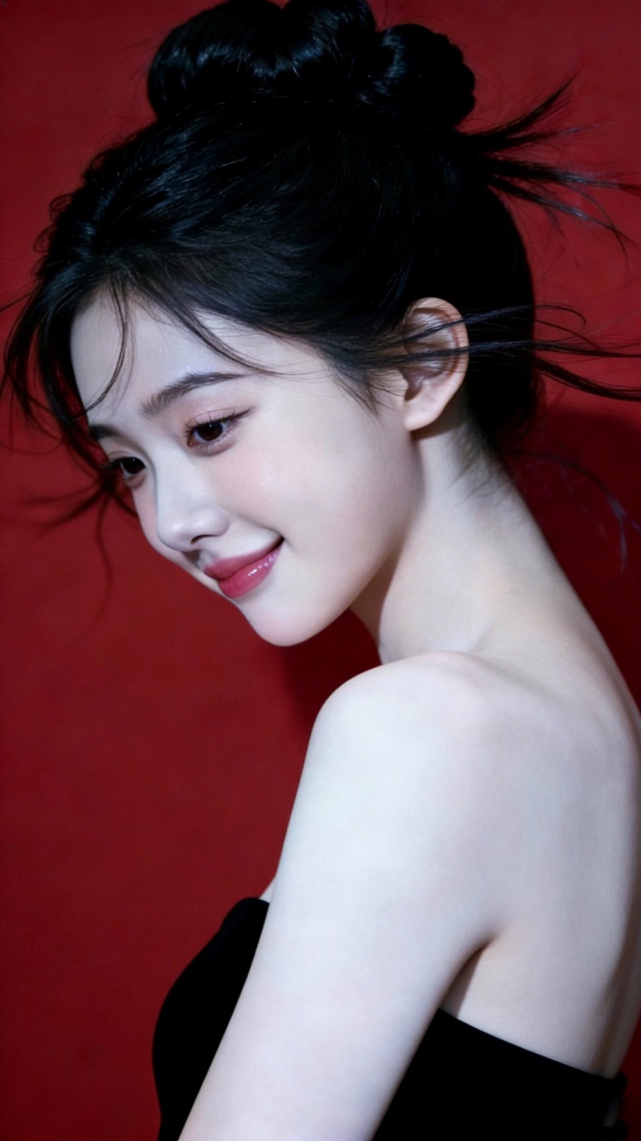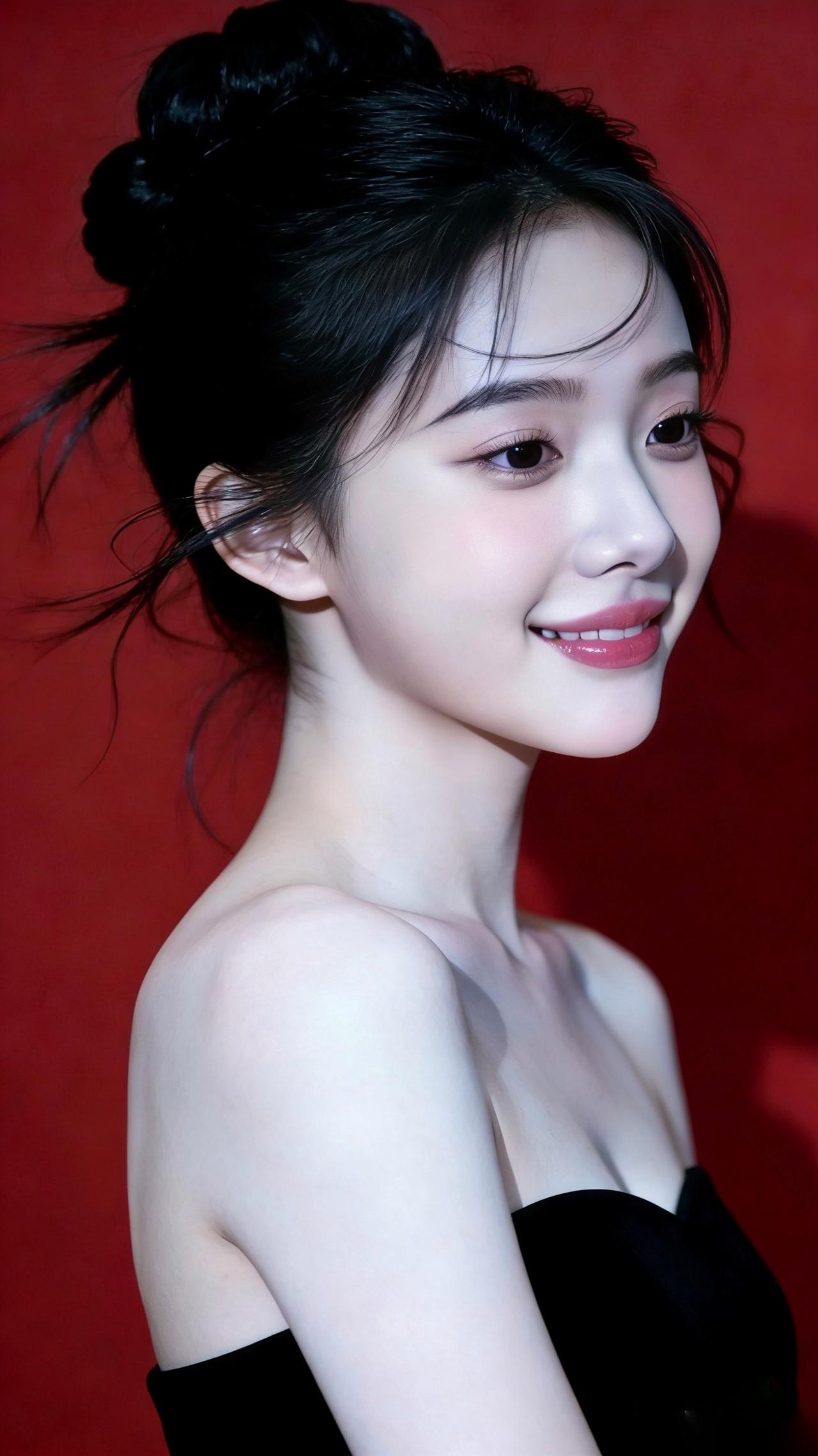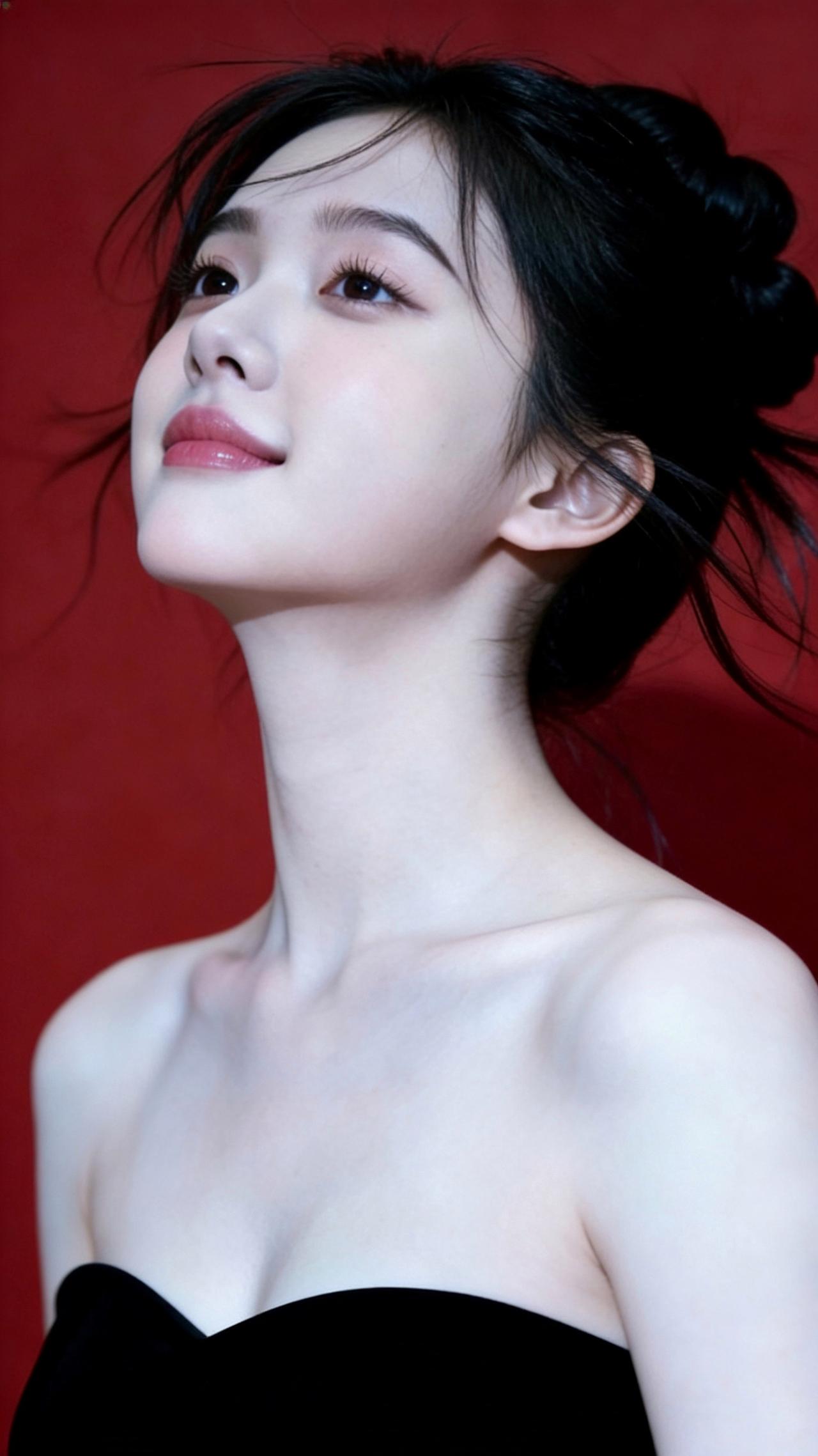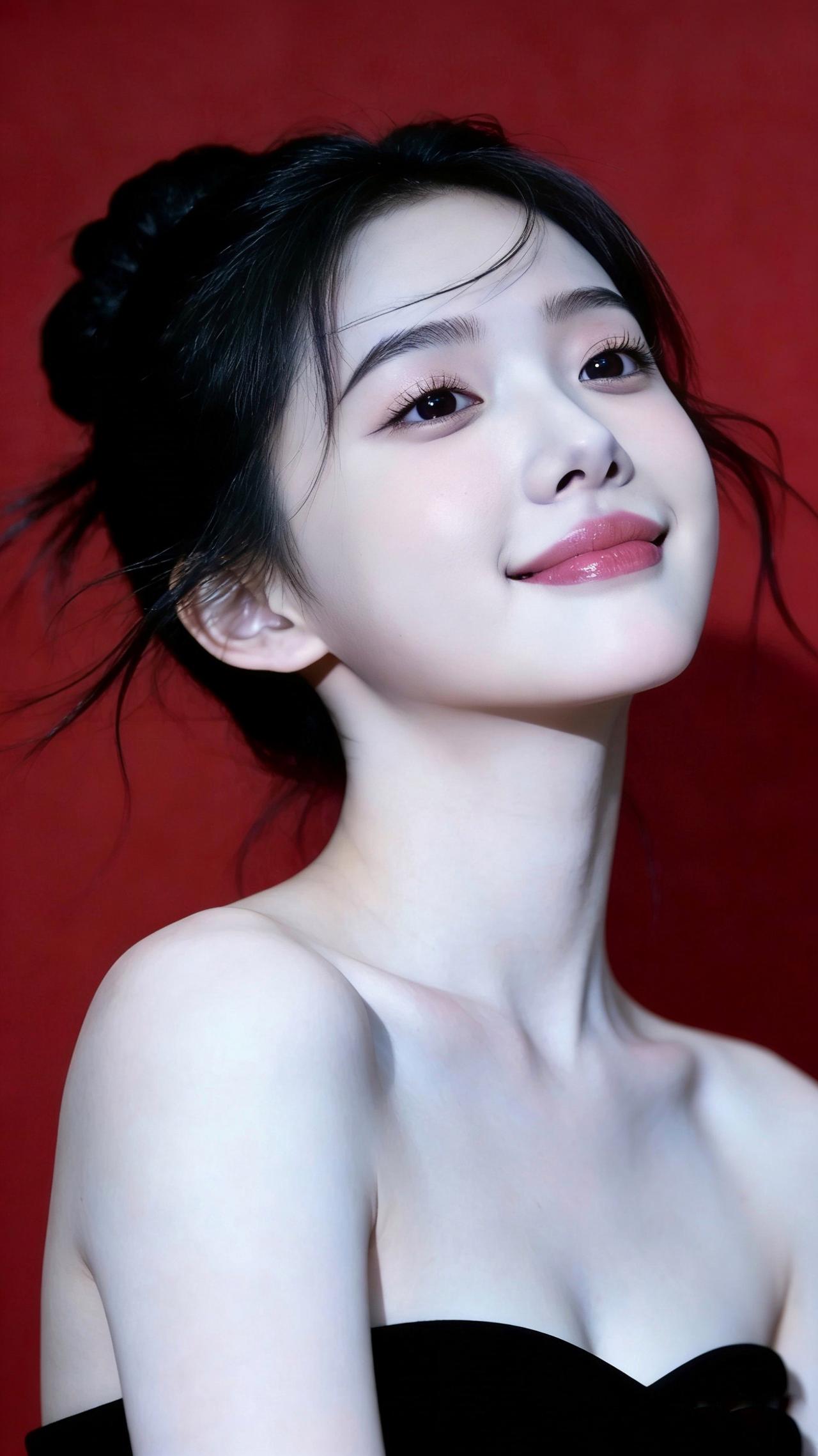 九帧红黑撞色画卷!高盘发碎发俏,黑抹胸衬肩颈如诗。柔光吻过肌肤,勾出眉眼含笑轮廓
