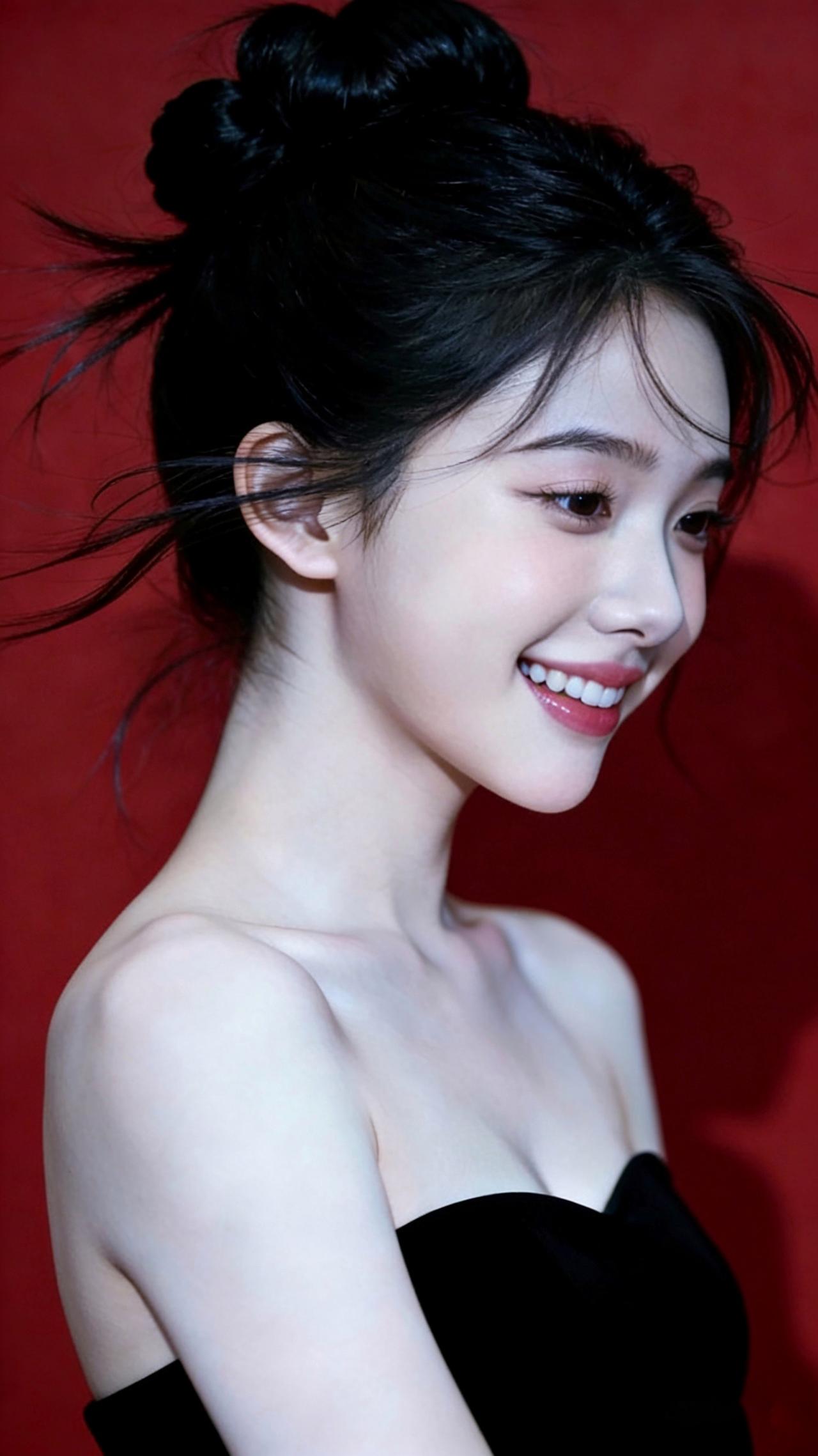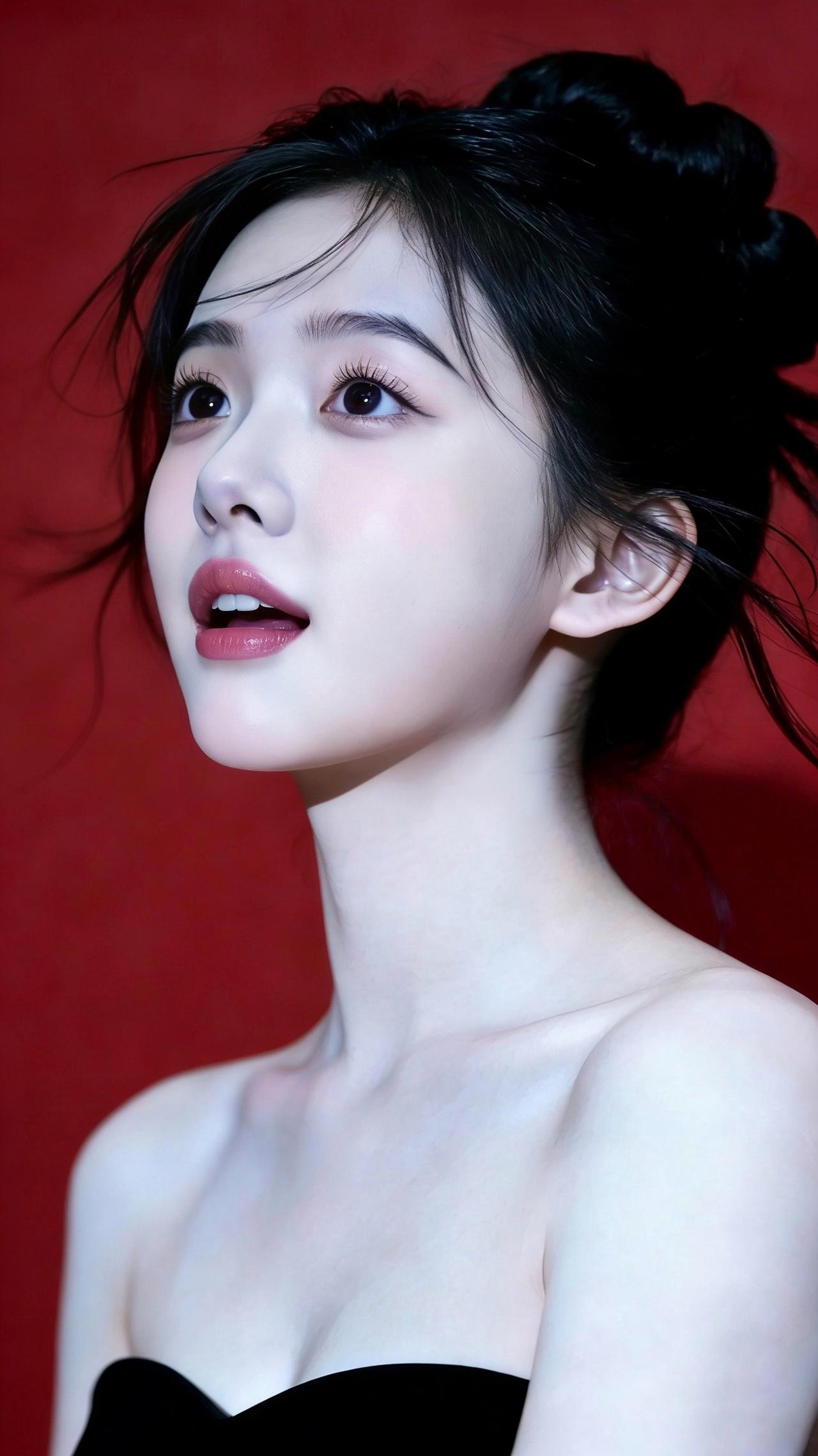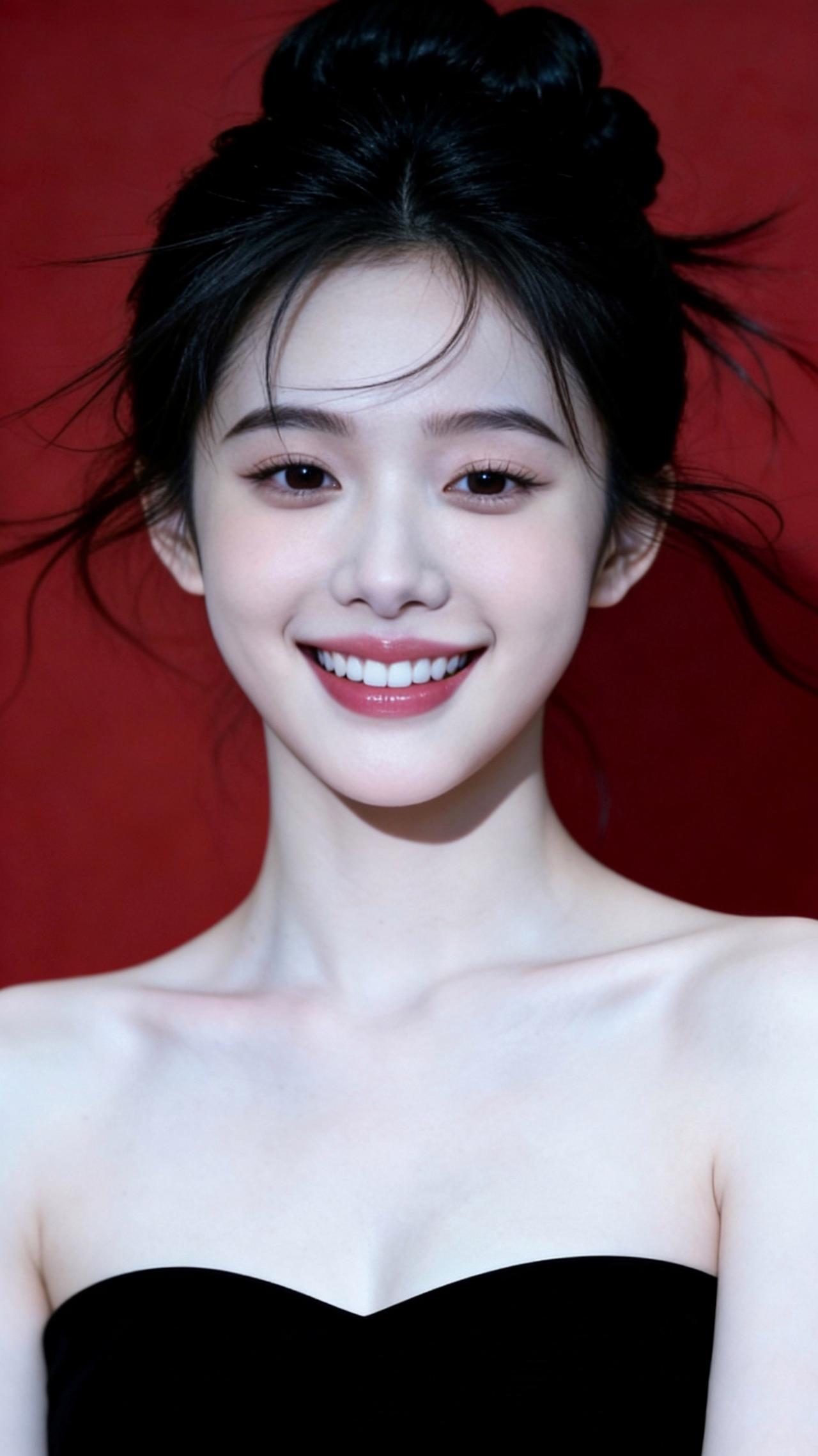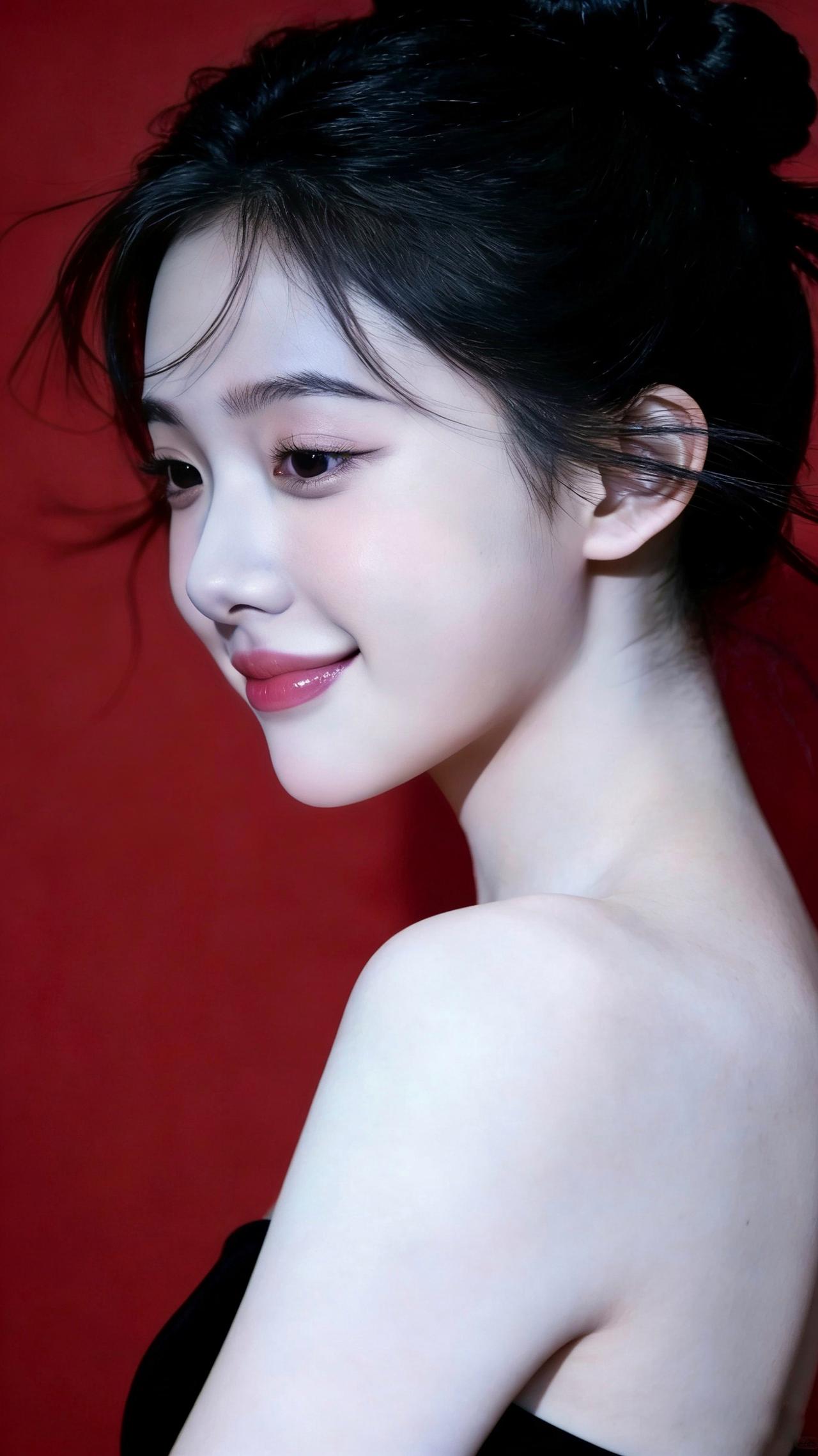 九帧红黑撞色画卷!高盘发碎发俏,黑抹胸衬肩颈如诗。柔光吻过肌肤,勾出眉眼含笑轮廓
