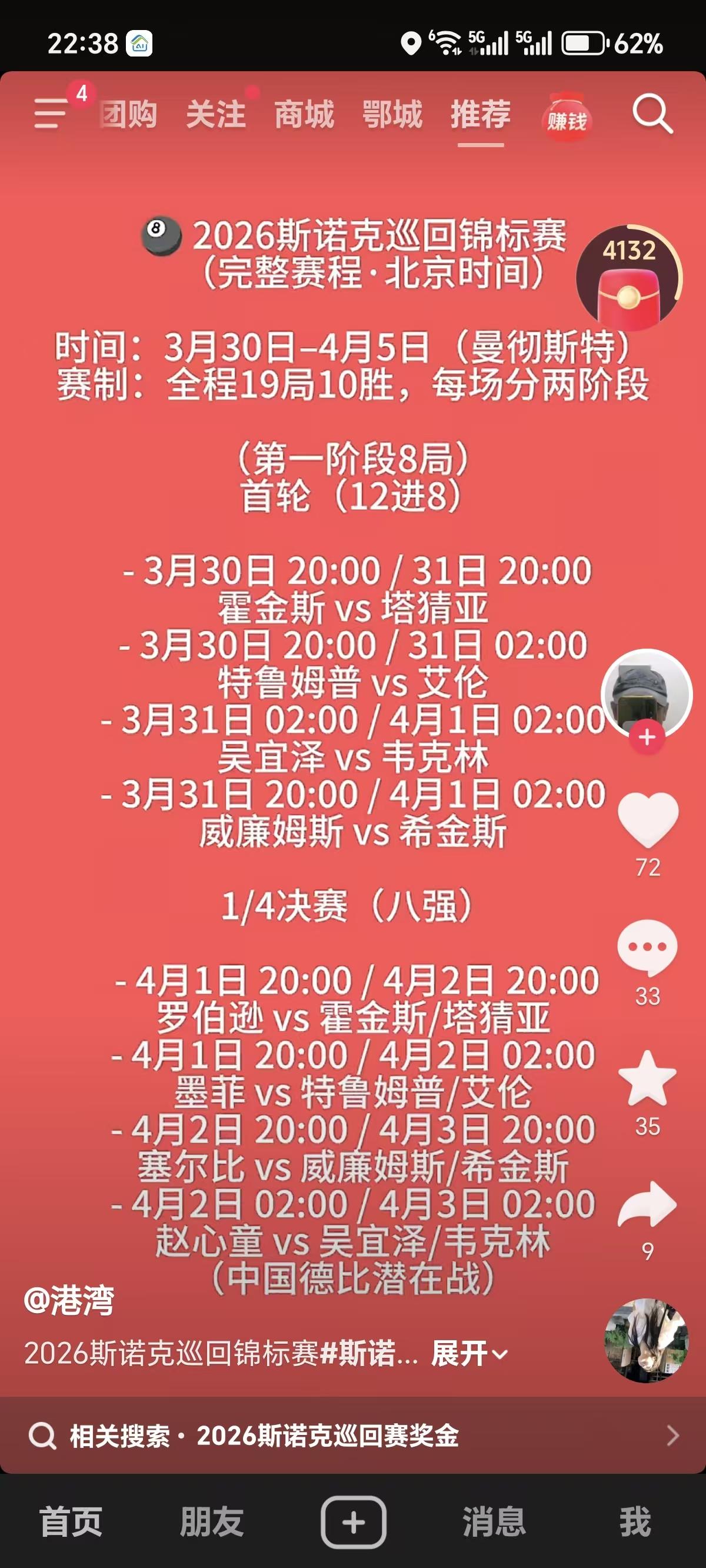 2026斯诺克巡回锦标赛冠军概率推算 基于2026年3月27日最新赔率、状态与签表,给出冠军概率推算(不含投资建议)。 🏆 2026巡回锦标赛 冠军概率(综合推算) - 尼尔·罗伯逊(1号种子):28% 巡回赛2冠、3进决赛,长局制最稳;签表下半区,首轮轮空,晋级路径相对友好。 - 赵心童(2号种子):25% 单赛季第2、背靠背夺冠(大奖赛+球员赛),进攻火力拉满;下半区,直通八强。 - 贾德·特鲁姆普(5号):18% 赛季多冠、进攻无解;但首轮遇克星马克·艾伦(交手19胜16负),上半区凶险。 - 马克·塞尔比(3号种子):12% 防守大师、决赛胜率66%;上半区,需过希金斯/威廉姆斯,硬仗多。 - 肖恩·墨菲(4号种子):7% 状态稳定,但上半区强敌环伺,突围难度大。 - 马克·艾伦(12号):4% 特鲁姆普克星,首轮爆冷可能,但夺冠需连赢4场,难度极高。 - 吴宜泽(7号):3% 首轮对韦克林,赢则遇赵心童;年轻冲劲足,但长局经验稍欠。 - 塔猜亚(10号):2% 新科世界冠军,但首轮对霍金斯(7连败),夺冠需连赢4场,小概率。 - 希金斯/威廉姆斯/霍金斯/韦克林:合计1% 经验足但状态下滑,黑马概率极低。 📌 关键影响因素 - 签表:赵心童、罗伯逊下半区更顺;特鲁姆普、塞尔比上半区死磕。 - 状态:赵心童、特鲁姆普、罗伯逊近期最热;塔猜亚、吴宜泽冲劲足。 - 长局制:塞尔比、罗伯逊、希金斯占优;特鲁姆普、赵心童需稳定性。 ✅ 一句话结论 罗伯逊、赵心童最热门(合计53%);特鲁姆普、塞尔比次之;中国双雄有望会师四强。