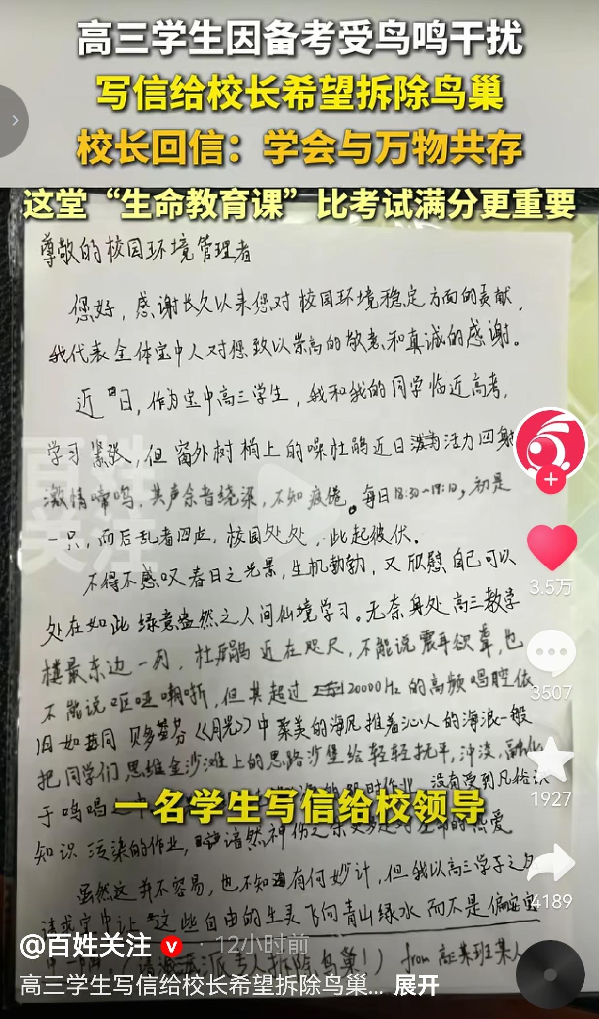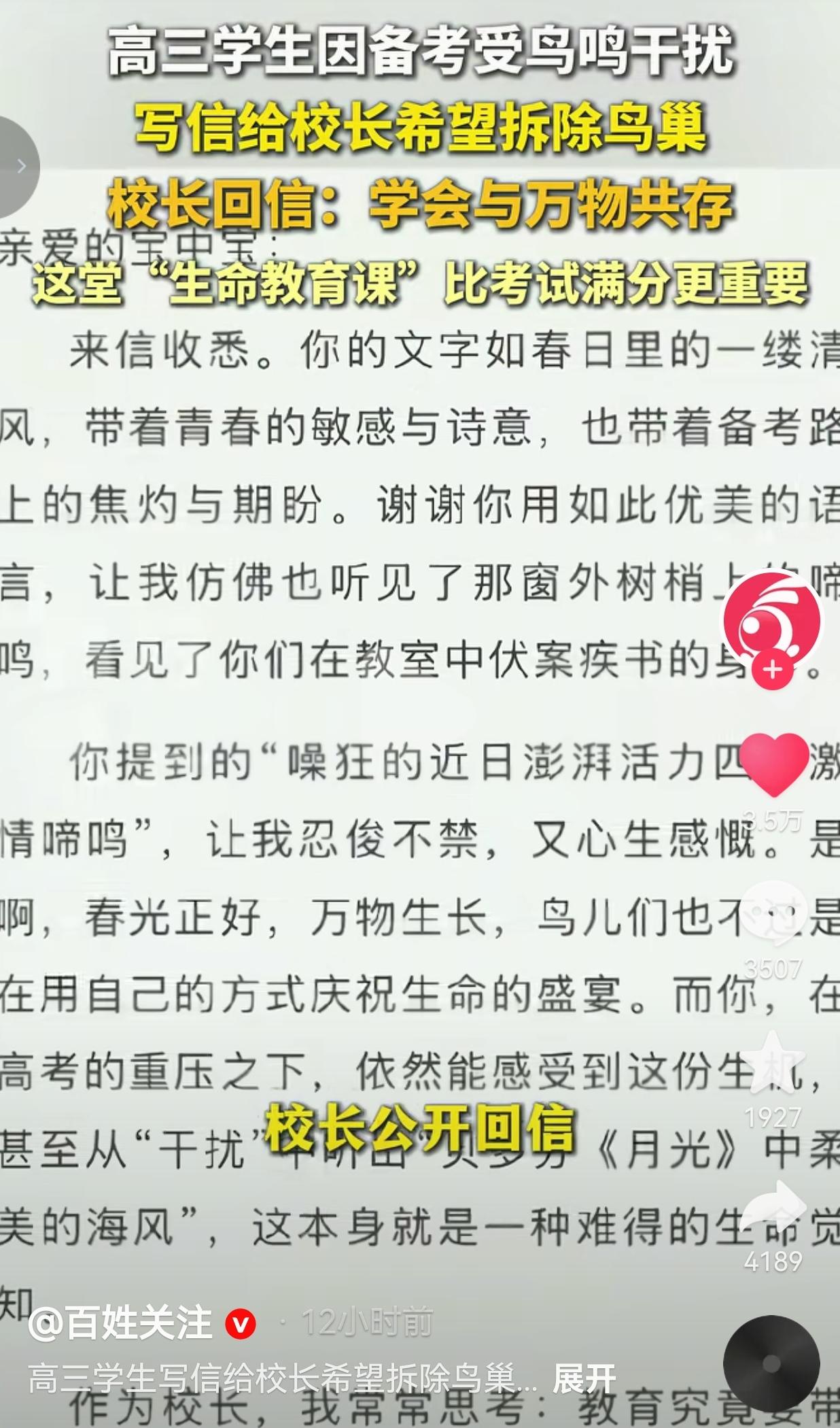 这才是比高考满分更狠的一课!深圳宝安中学一个高三娃,为了备考居然要把窗外的鸟窝拆了,校长的回信直接把我看哭又看怒!这堂“生命教育课”,比任何一张满分试卷都更能打动人! 这届高三生真的拼到极致了:每天18:30到19:10,窗外树上的噪鹃跟打了鸡血似的,“激情啼鸣”,那高频叫声直钻脑子,把刷题的思路冲得稀碎。 娃急了,提笔给校长写了封信,文笔还挺绝:“其超过20000Hz的高频唱腔,依旧如同贝多芬《月光》中柔美的海风推着沁人的海浪一般,把同学们思维金沙滩上的思路沙堡轻轻抚平、冲淡、融化于鸣唱之中。” 字里行间全是备考的焦灼,最后直接放话:“请让这些自由的生灵飞向青山绿水,而不是偏安一中一隅!(请速速派专人拆除鸟巢!)” 结果校长的回信,直接给这届孩子上了一堂比高考还重要的生命课:“教育的终极目标,不是让世界适应我们,而是让我们学会与世界相处。” “这些鸟儿,本就是校园的一部分,是你们这一季青春的共同见证者。” 还贴心给建议:把鸟鸣当“黄昏音乐会”,是大自然给奋斗的你们加油鼓劲! 这哪里是拒绝,分明是在告诉孩子:与不完美共处,才是伴随你一生的财富。在这个连AI都能替我们算题的时代,这份对生命的感知、对世界的共情,恰恰是我们最该坚守的东西。 网友看到后评论说:“笑死!我高三的时候连楼下广场舞都想举报,这娃居然想拆鸟窝!太真实了!但校长这话真戳心,现在回想起来,当年烦得要死的蝉鸣,居然成了最怀念的青春BGM。” 有一位老师说:“作为老师,我太懂这种焦虑了!但校长说得对,高考只是人生一站,学会尊重生命、和世界和解,才是走得远的底气。这波校长赢麻了!” 也有的网友说:“现在才明白,当年高三最珍贵的不是分数,是窗外的春天、同桌的笑声,还有这些烦死人的鸟鸣。要是当年有人跟我说这些,我可能就不会钻牛角尖了。” 还有一位宝妈说:“我家娃也高三,天天喊压力大。这封信我要给他看看!分数重要,但教会他做个有温度、懂共情的人,比什么都强!” 说实话,我太懂这个高三娃的崩溃了!高考前的每一分每一秒都像在抢命,窗外的鸟叫、走廊的脚步声、甚至同桌的呼吸声,都能成为压垮神经的最后一根稻草。谁不想在绝对安静的环境里刷题刷到天昏地暗? 但校长的话,像一盆冷水,又像一束光,浇醒了我们:我们总以为,要把世界改造成适合自己的样子,才叫成功。 可真正的成长,是在嘈杂里能静下心,在不完美里找到诗意,在压力里还能抬头看看春天。 高考很重要,但它只是人生长河里的一朵浪花。而学会尊重生命、和万物共存,才是能让你走一辈子的底气。 在AI都能替我们解题的今天,这份能听见鸟鸣、看见春天的感知力,才是我们最珍贵的竞争力。 这个娃可能现在还会抱怨鸟鸣,但多年后他一定会想起:高三那年的春天,有一群不知疲倦的鸟,陪他一起熬过了最难的日子。那是比任何满分都更珍贵的回忆。 最后,我想说的是:别让分数,遮住了你眼里的春天。 对此,你怎么看?