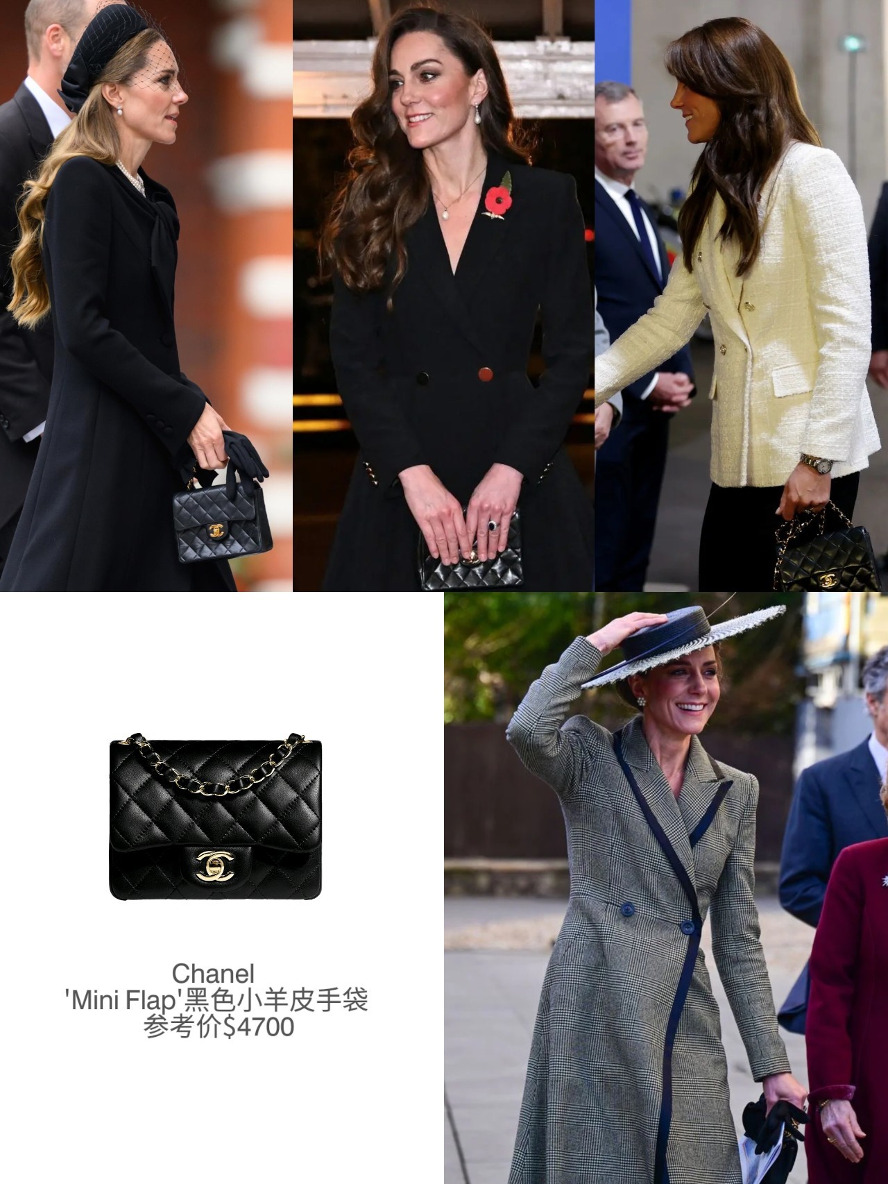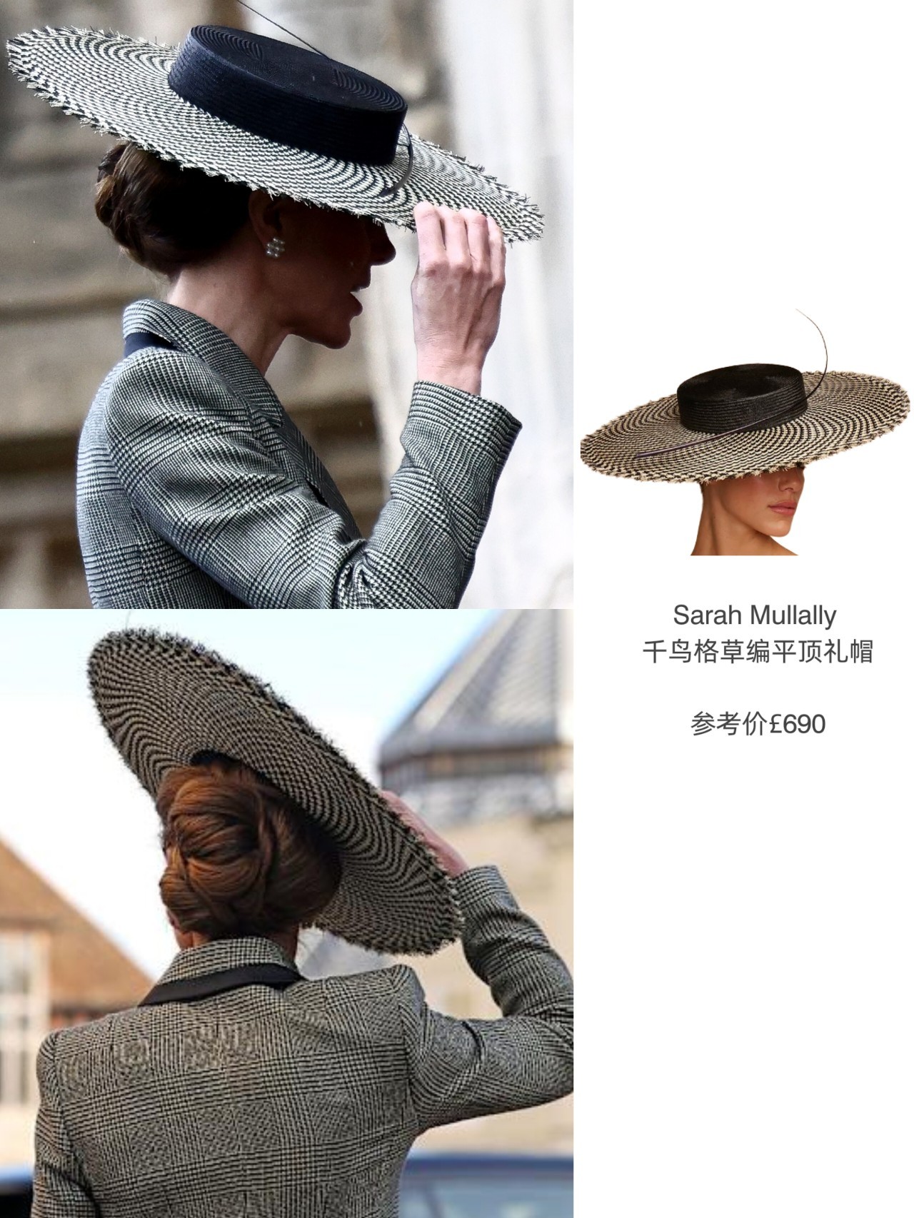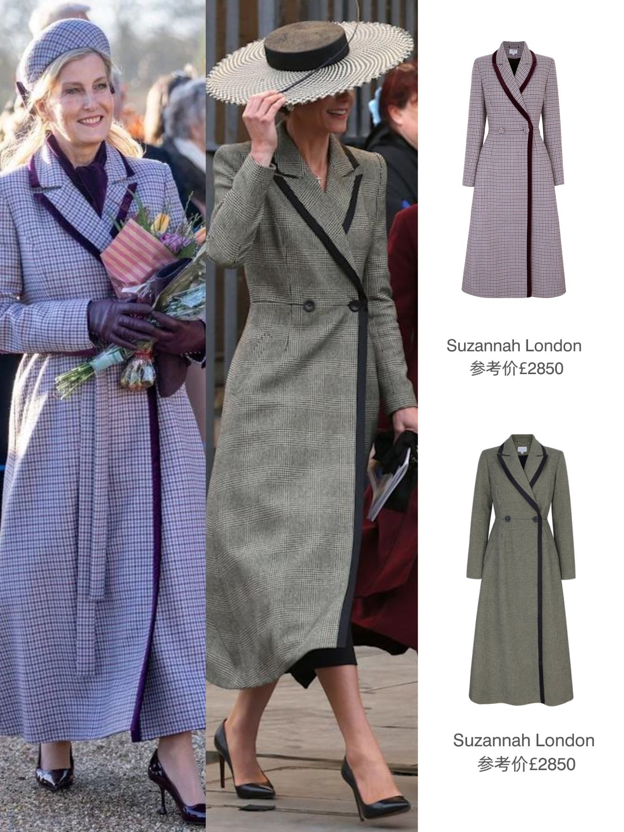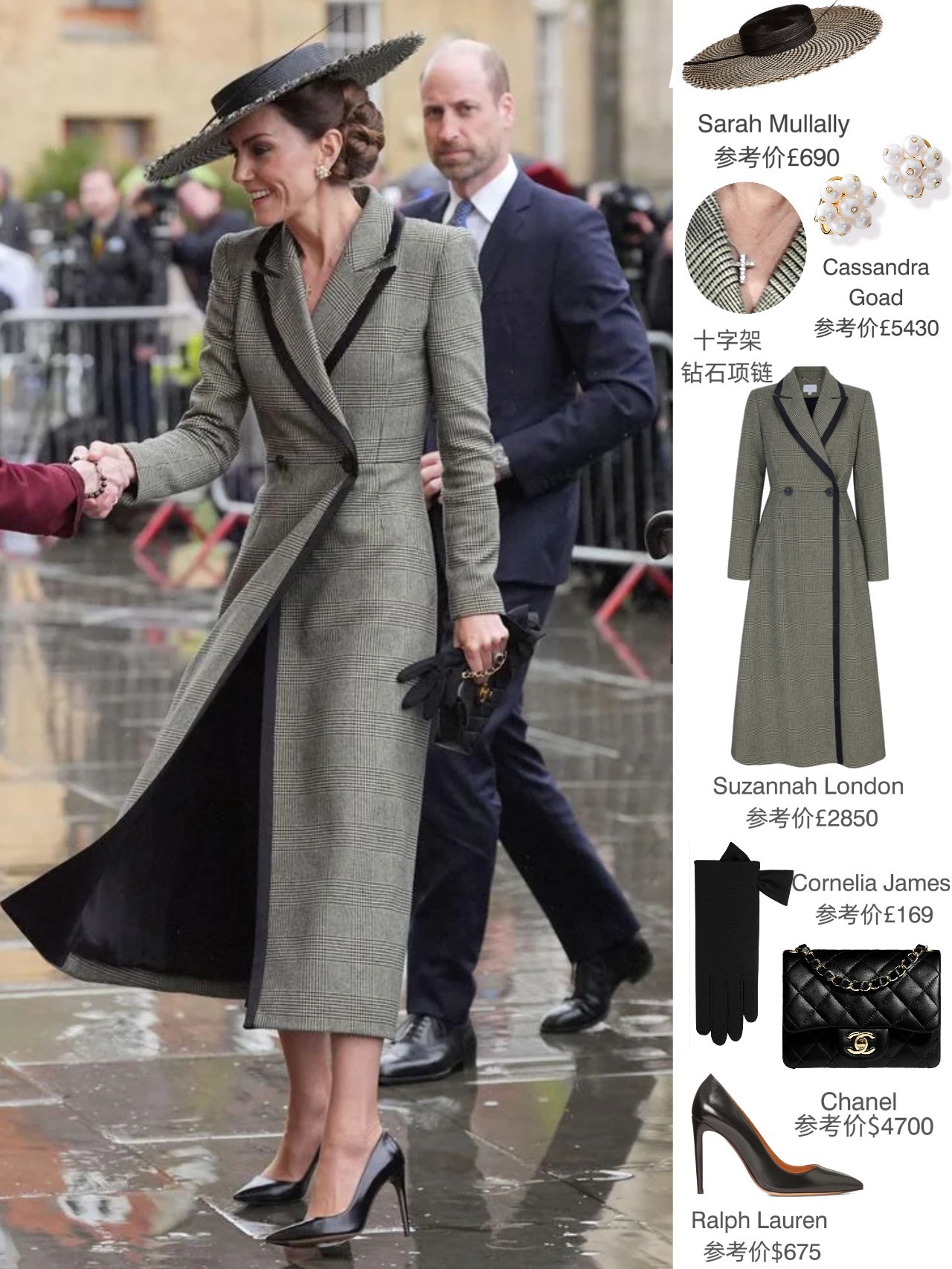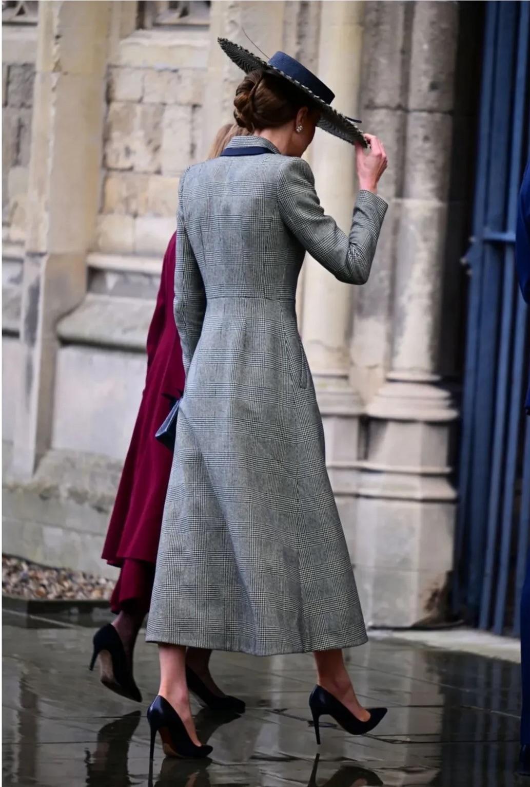 当日凯特是选择了一袭来自隔辈闺蜜苏菲爱牌Suzannah London的大衣(恰巧苏菲也有同款,去年圣诞日有上身),有搭配Sarah Mullally的宽檐礼帽和Chanel的手袋……
