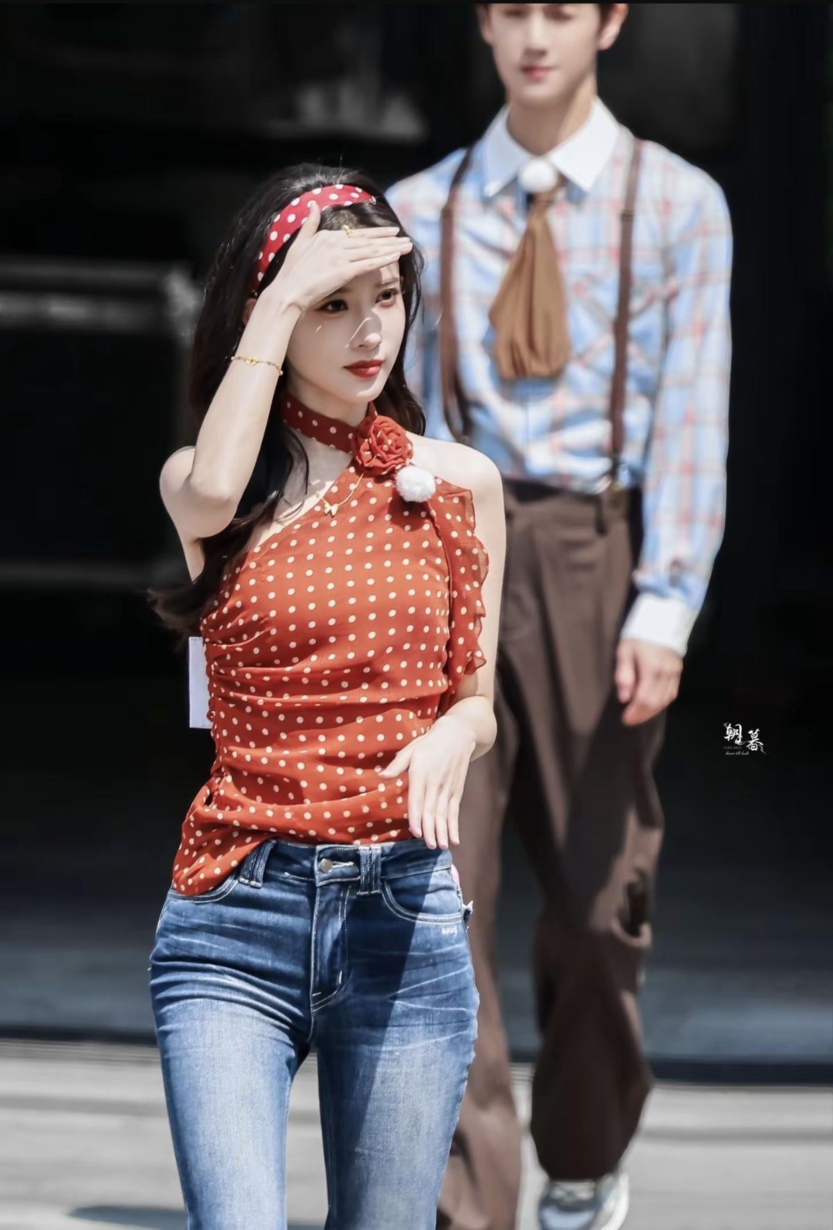 孟姐的复古波点造型太绝了[赞]红底白点挂脖上衣+同色系发带,搭配牛仔裤,港风氛围