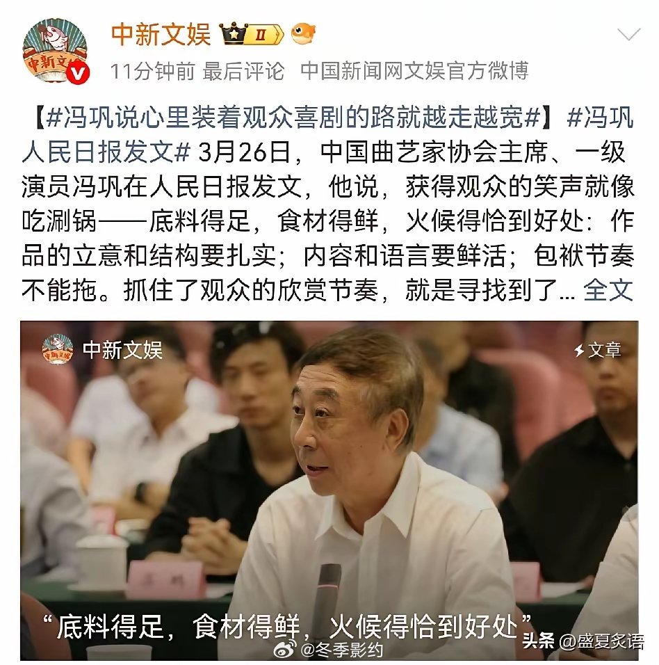 冯巩,冲上热搜!3月26日一大早,一向低调的的冯巩,突然冲上了热搜,这次他传来了一个大好消息,作为曲艺家协会主席,他在人民日报发文,聊透了喜剧创作的门道,还直言了AI在这行的短板,句句实在又戳心。他把逗乐观众比作吃涮锅,底料要足、食材得鲜、火候还得掐准,这不就是说作品立意要稳、内容要活、包袱节奏不能拖吗?抓准观众的笑点节奏,其实就是踩准了时代的审美步调。从剧场到短视频时代,冯巩自己也一直在跟着时代走,今年春晚他的作品就揉了烟火气、地域味,甚至还玩转网络热词,和中小学生互动都零代沟,连和孙子聊天都多了共同话题。面对当下大火的AI,他也看得通透,说AI能学创作套路,却复制不了创作者的灵感和独有的风格,说到底只是帮手而非对手。