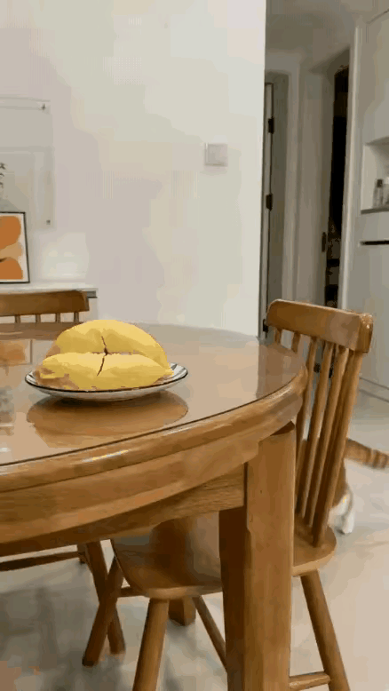 笑喷了~主人扒完榴莲,装在盘子里放在桌子上。 小猫好奇地蹦上桌子,就连大粪车路