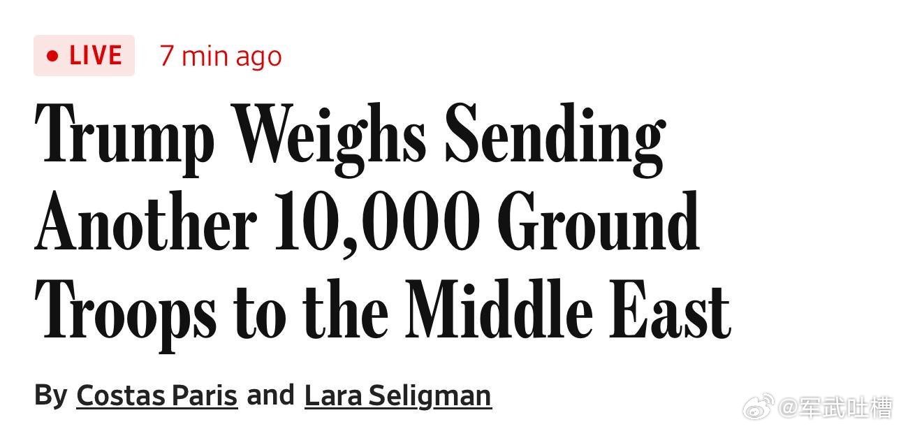 兄弟们,美国人又要增兵了!《华尔街日报》报道,五角大楼正考虑向中东增派至多1万名地面部队,以扩大特朗普总统在伊朗的军事选择。增派1万加上之前已经派过去的1万,再算上中东各基地里的,满打满算也不超过5万人5万人就想进入伊朗这种体量的国家打地面战?那肯定不可能,所以特朗普想的还是占据波斯湾岛屿和伊朗沿海的重要港口,打一场有限的陆战,挽回美国的颜面特朗普称对伊能源空袭再推迟10天伊朗正式回应美国15点停火协议美伊以冲突