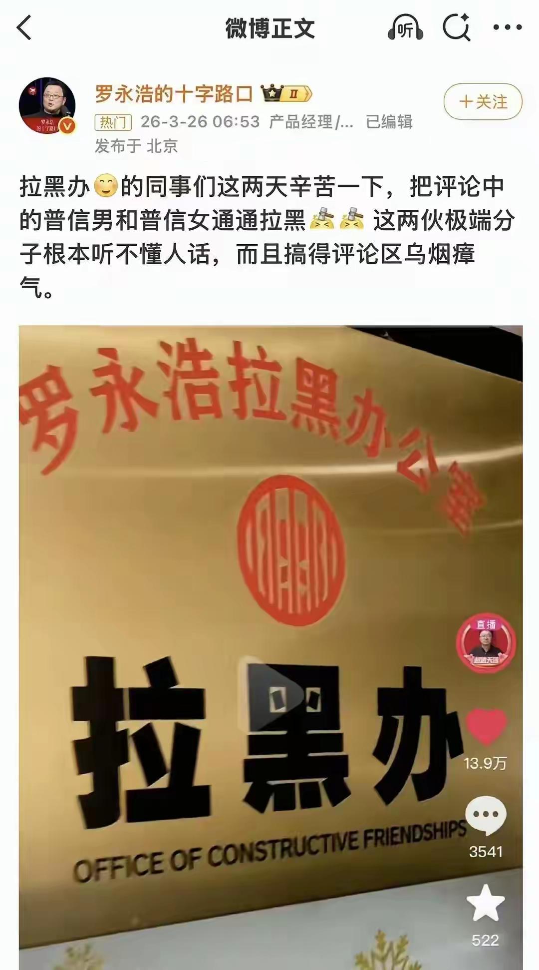 3月26日,罗永浩邀请杨笠做全网首播对谈,引发大量网友抵制。 罗永浩公开力挺杨笠,称其并无恶意、不搞对立;同时下令大规模拉黑评论区反对者,并称抵制双方为普信男女,认为他们扰乱评论区、听不懂人话,态度强硬。实际上,大家抵制的并非某个人,而是那些极易挑起性别对立的内容。此次罗永浩直接维护杨笠,还拉黑批评他的人,未免显得过于强硬了。公众人物说话理应注意分寸,一边宣称反对对立,一边给网友贴标签,在逻辑上实在难以自圆其说。公开直播本就应当接纳不同的声音,并非顺着你的意思才叫理性,不顺着就拉黑、嘲讽,这并非交流,而是只听自己想听的话。身为公众人物,如此做法着实容易消耗路人缘。 不能因为你支持某人,就将不支持的人一概贬低。拉黑、扣帽子无法解决争议,只会让大家更为反感。希望能少一些对立,多一些就事论事。