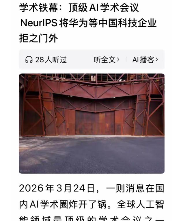 将中国排除在外! 世界顶级人工智能大会将华为等中国科技企业排除在外,理由是上了美国制裁名单。还记得当年很多人鼓吹科技无国界,甚至教育无国界。 2026年3月,那个被看作“人工智能天花板”的国际会议NeurIPS宣布了新规。按照美国的法子,像华为、商汤、旷视、中国移动这些中国科技巨头,一股脑儿都不能投论文、不能做审稿、什么服务都别想。 这下子,整整八百多家中国机构同时被“请”到了会场外面,理由就是美国有制裁名单。原来说得满天飞的“科技无国界”,弹指一挥间成了泡影。这口气,换谁都觉得堵得慌。 其实这种事儿以前就冒过头。2019年国际电子电气工程师学会闹过一次,这回升级成全面“画地为牢”,从几家变成上千家。 简单说,这不止是卷进企业,而是把一大批中国科研的主心骨都关在门外。以前科技圈总说学术交流是全球的事儿,不分国界,公开透明,现在看上去变味了,直接拿名单说话。 NeurIPS自己不避讳,说他们根本没得选。作为美国管着的组织,理所当然要听美国财政部的话,相关服务不许提供。这一纸规定撂下来,外交腔调再多,最后还是门关了。 影响范围可不是圈个小圈子,名单上有中国最有实力的实验室、全国重点的研究院校,还有不少家底厚实的科技企业。被勒令不能参会,等于把中国AI研究人员的声音切掉,学术成果也没了国际同行互相切磋的那扇窗。 国际学界这次也不都买账。中国计算机学会马上表示反对,建议中国学者别再投这个会。不光是中国有怨气,一些国际知名学者也实打实表明态度,拒绝再做主席、审稿人,觉得这政策说穿了是在搞排外,削弱了学术的公正和独立。就像把球场一分为二,限定谁上场,谁下看台,大家都明白这其实动了根本。 说到底,美国官方这波操作背后,是“护城河”思想更深了。他们不是只要守好眼前的芯片和硬件,更想着让未来的创新人才和创意都别进来。这几年美国对中国科技企业、产品、人才接连设防,从芯片软件到全球AI交流,牌一张接一张地打出来,就是想尽办法卡住后路。 为什么呢?中国AI领域的影响力这些年蹭蹭往上走。不是什么玄学,就是事实摆在眼前。前年,中国顶级高校的AI成果在NeurIPS的论文数据里亮相,整体贡献比重已经能和美国老牌大院相提并论,中国科技企业也在AI学术上屡屡发声。如果把中国排除在外,对这个会议的影响不用多说,谁还敢叫它“世界顶会”。 细想背后,美国的逻辑并不费解。一方面收紧政策,不让中国学生、学者太容易沾边“核心技术”;另一方面,他们许多科技巨头和实验室里又少不了华人或者中国背景的骨干。 这种“又怕又想用”的复杂心理,实在有点难为各家企业和学术机构了。表面上说要保护“技术安全”,其实就是担心根基动摇。 对于中国科技圈来说,这次被推到台前,挑战自然不少,调整也是逼出来的。制裁最初带来实打实的难题,比如国产手机业务一度遇冷,但也让中国自主搞研发的劲头更实在了。 从国产芯片到操作系统,还有AI、云端、智能汽车这些方向都在加码升级,该啃的硬骨头只能自己啃。用不要门票的广场,对抗只认会员的俱乐部,不在一家会议塞不进去的时候哭鼻子,该干的活它还得继续。 有些人担心,中国学者短时间会因为曝光变少,国际影响力受影响。可硬币翻过来看,主动围起围墙的NeurIPS想独占话语权,反倒逐渐失去了全球AI领域的活力。没有中国参与,思想碰撞的火花自然暗得多,会议本身也包容不下太多变数。 而中国一边垒台搭场、强化自身的学术平台建设,一边在AI大模型等技术领域用开源把更多开发者拉进生态,新的创新广场悄然养成,不怕没有舞台,怕的是没人在台上跳舞。 这一回合,其实走的不是短跑赛道。美国靠画圈定规矩想守老本,但只要技术发展不停,谁也靠不住过去的优势吃一辈子; 中国则一边攻坚核心卡点,一边把创新的广场修得更敞亮,把舞台搭给更多人。路怎么走,时间见真章。能持续打磨自身硬实力,挑大梁,熬得住压力,才有资格说长远。 到头来看,科技进步的底色一直是交流和协作。哪怕一时有人盖上“学术铁幕”的帘子,也拦不住知识和创新的涌流。等风吹过去,谁真正选择敞开大门,谁才能成为新秩序里的领军者。