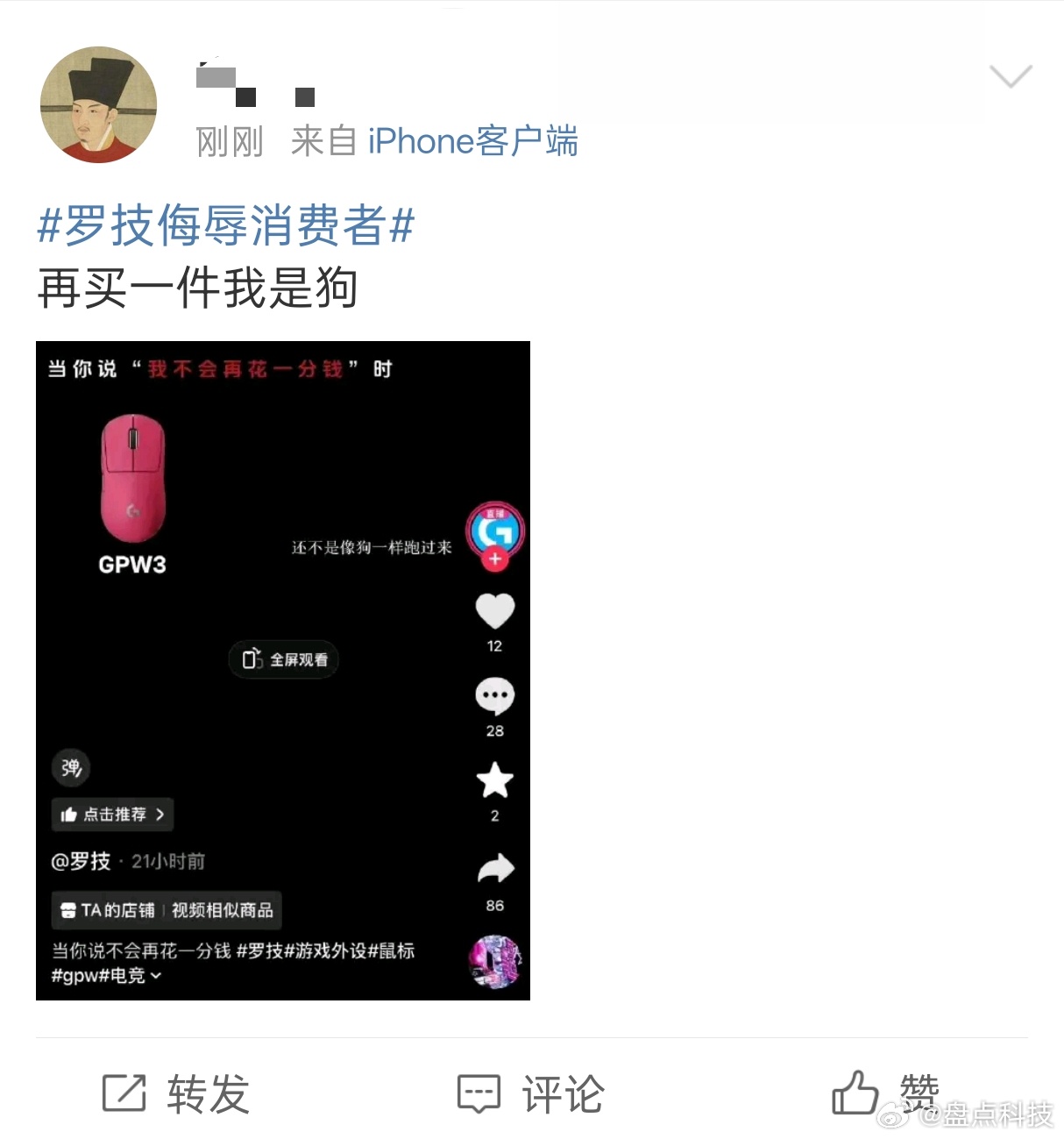 罗技侮辱消费者网友评论:①再买一件,我是狗!②666 花钱当狗了兄弟们!③我现在用…真是晦气 !