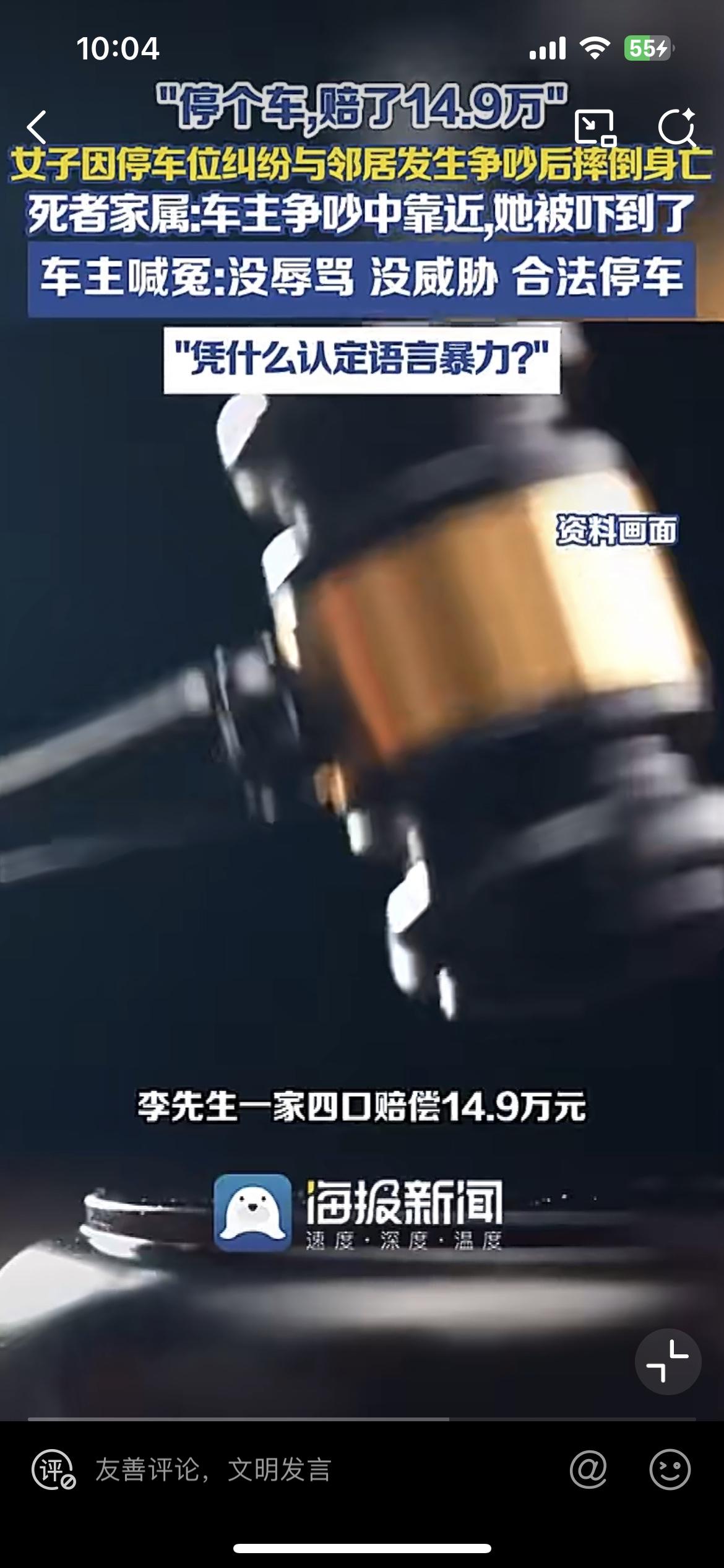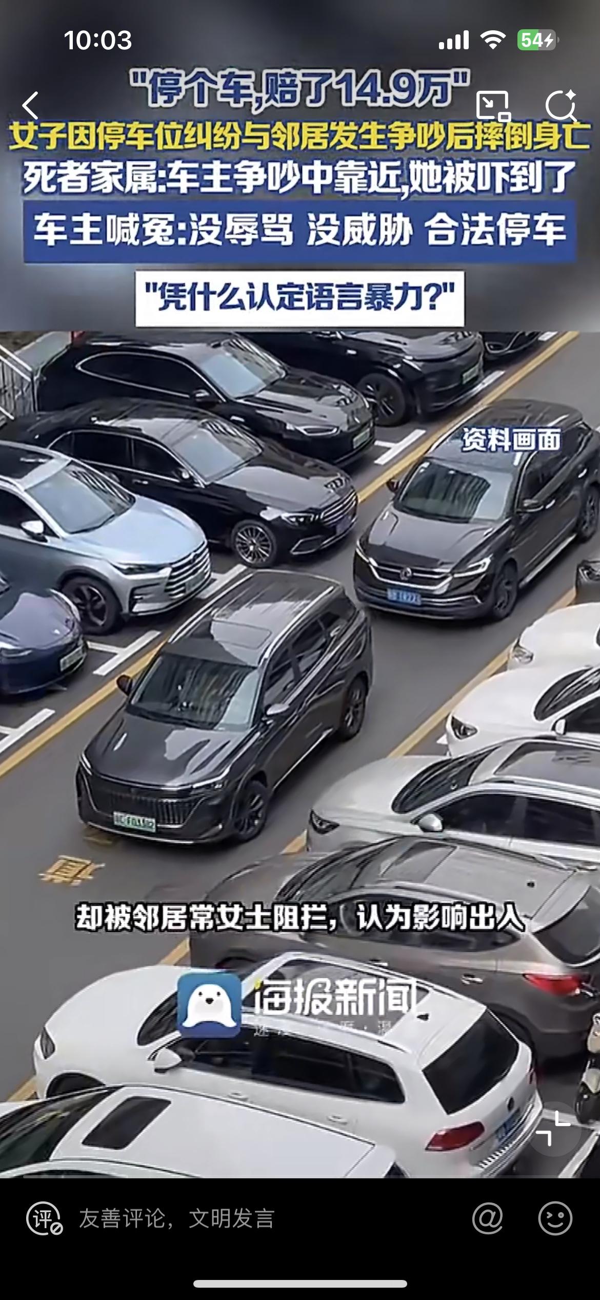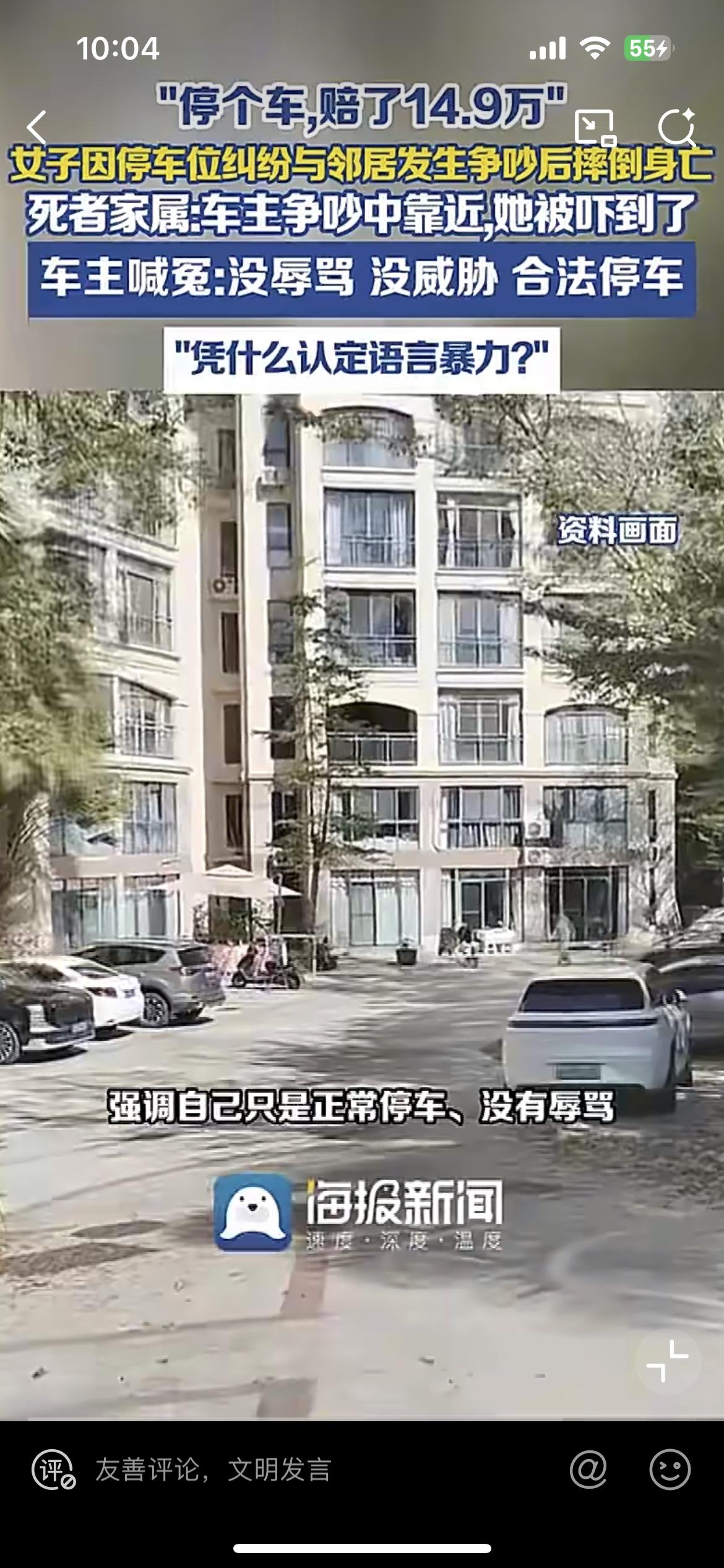 女子因停车问题与邻居产生纠纷,情绪激动倒地死亡,女子家属找邻居索赔 122 万。事发海南万宁一小区,邻居在公共停车场停车,路过的女子认为阻挡出行,和邻居发生争吵。女子突然情绪激动,倒地身亡。家属把邻居告上法庭,法院审理认为邻居和男子争吵,有辱骂行为,双方靠得太近,对女邻居构成惊吓,所以导致死亡。后经过尸检发现女子患有冠状动脉硬化疾病。法院认为女子的死和邻居有一定关系。需酌情赔偿 14.9 万元,邻居喊冤,要上诉。