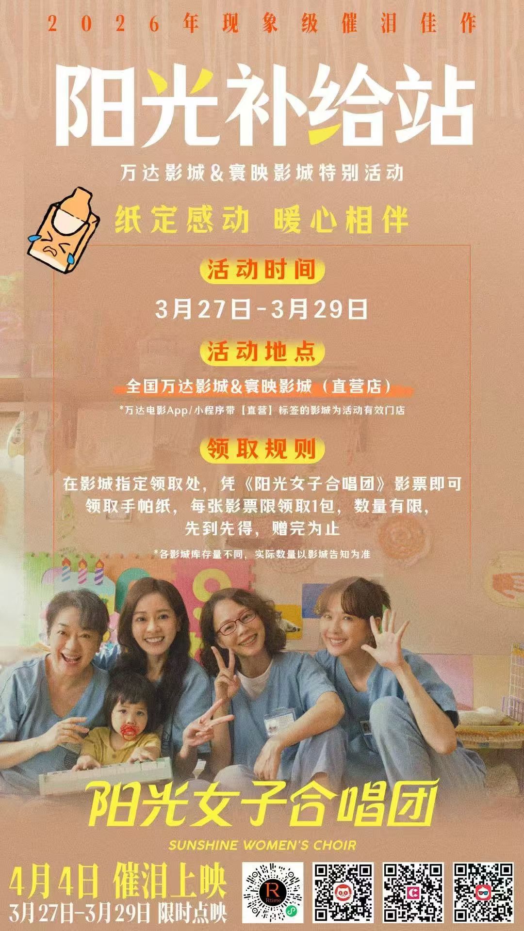 《阳光女子合唱团》点映万达大部分直营店自营渠道9块9,这价格真的香,还能领手帕纸。