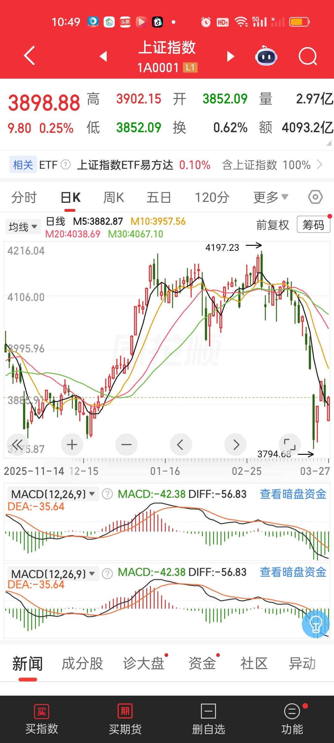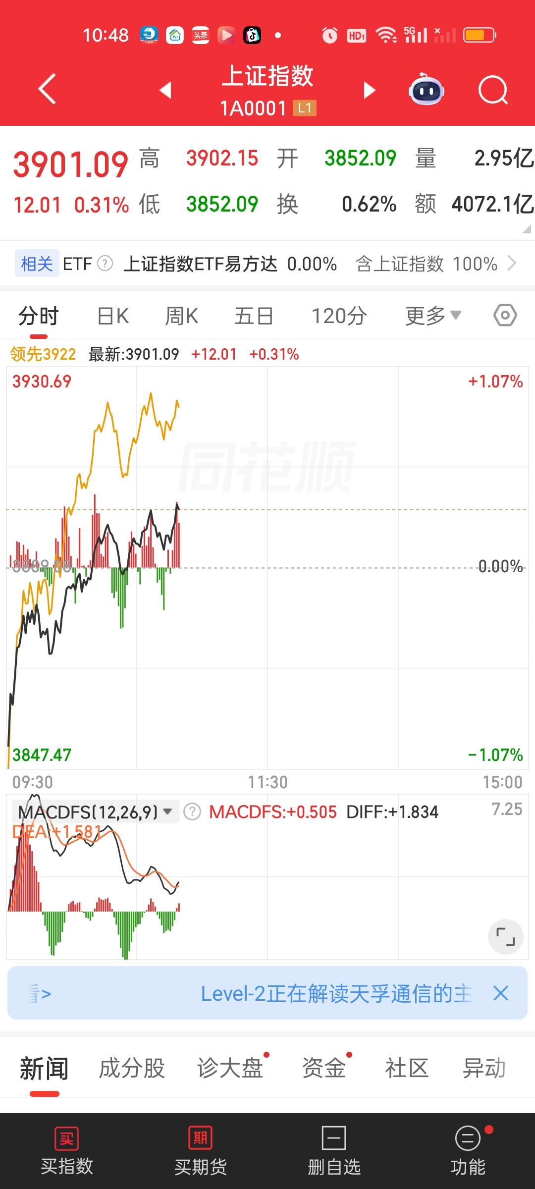 今天的盘面不能说不强势,尽管盘面是超级低开的,但这种低开只维持了几秒随后就是超过50个点的急速拉升。一口气爆拉50点,而且上涨家数也有近4000家,有55家涨停。这样的盘面走势你不能说不强吧? 但成交量依旧缩量了近千亿。昨天是今年首次破2万,今天恐怕也很难上2万,量能上不去,对后面的行情就不能有太大的期盼。我们需要看到一根最少2.8万的大阳线,一直缩量很难有高度。3852.09距离前低3794.68不远,3794.68/3852.09=0.9851,距离前低实际也只有1.49%的下跌空间。我还是认为3794.68会破一下的。极限3744附近。