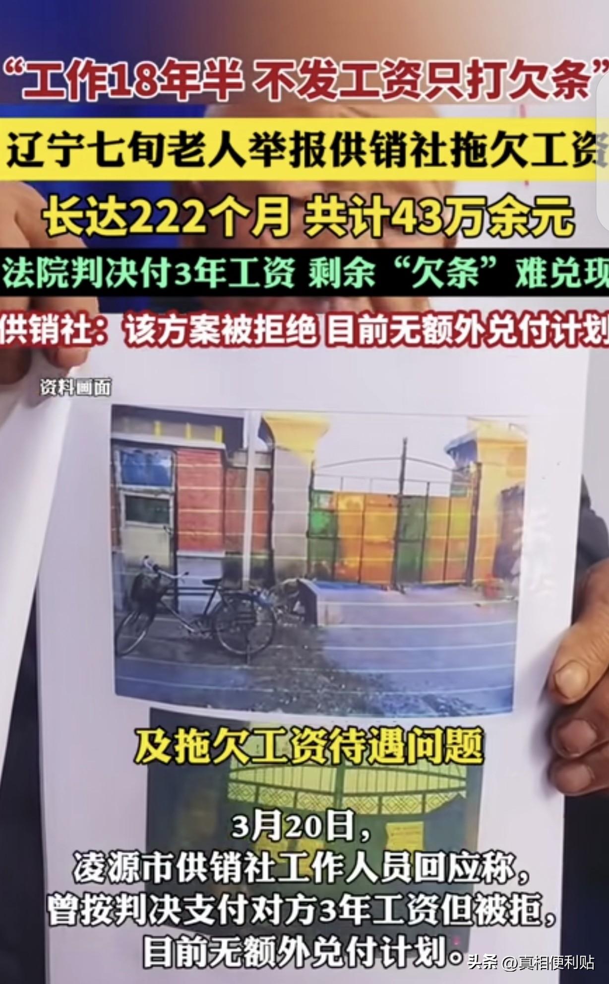辽宁,一7旬大爷,在供销社上班18年,供销社不发工资,只打欠条,欠了222个月工资,累计43万多元,大爷一气之下把供销社告了,法院判决供销社给大爷3年工资,剩下的继续打欠条,大爷坚决不同意,就想有生之年拿回自己的辛苦钱,2026年供销社又挤牙膏一样,要给大爷3万,大爷崩溃了! 2026年3月,辽宁凌源市三十家子镇,王朝文已经73岁了。 他手里一直留着一沓欠条,纸张发旧发软,边角卷起来,有的字迹都开始发浅,欠条上盖着章,金额一张张加起来,最新核出来的数是43万元。 可他最近等来的处理意见,却只有一句话:最多给3万元,拿了就算了结。 王朝文当年进供销社,是1993年的事,那时候他干的是基层杂活,卖货、看门、值夜班,谁缺人就顶上。 工资不是没有,只是单位常说周转不开,先不开现金,先写条子,欠条一开就是一张,写明欠多少、什么时候补发,盖个章,叫大家“别急”。 他信了,也没办法不信——人在单位干着,日子还得过,很多时候连争辩都显得多余。 这些年里,他不只是等工资,有些开支单位让他先垫着:办公用的零碎东西,修修补补的材料,可能金额不算大,但次数多了就积成了一笔。 他把这些也记下来,凑在一起让单位写欠条,时间长了,欠条越攒越厚,收在一个袋子里,后来干脆分几次装,生怕丢了,222个月、18年半,他说自己几乎就没真正,按月拿到过一份准时工资。 2011年,他被“清”了出来,单位的房子卖了,人员也就散了,他只能收拾东西回家,按理说,人走了账该结,但他得到的还是那句老话:再等等,等有钱了再说。 他不是没找过,找了很多年,跑了很多趟,结果每次要么没人管,要么就一句“历史遗留问题”,拖到63岁,他实在耗不动了,选择走法律途径。 2013年二审判决出来,法院确认了劳动关系,也认可欠薪事实存在,但最后能支持的金额很少。 理由集中在“诉讼时效”上:太早的部分被认为超过时效,只能按其中一段时间来算,于是只判了3年工资,大约1.2万元。 对王朝文来说,这个结果最难接受的不是“没赢”,而是明明欠条在手、事实摆着,最后却像只承认了他人生里很短的一截。 他没就此停下,之后这些年,他仍在反复找相关部门、找单位,希望按欠条把账算清。 2018年前后,法院、当地相关部门、供销社几方曾经坐下来谈过,当面把他18年半的工作时间、欠款总额等情况又过了一遍,也谈到要怎么分期、怎么落实。 王朝文当时以为终于有个能落地的安排,至少不会再是“口头答应”,但事情往往就卡在“谈过”和“执行”之间:协议可以写,字也能签,可后续能不能履行,又是另一回事。 到了2026年3月,他听到的最新说法变成了“给3万”,而且对方还解释:2013年判的那部分钱,他一直没实际拿到,现在就用这笔当作抵扣,折算在3万元里。 王朝文的疑问也很直接:判决那点钱本来就没兑现,怎么就成了“抵扣后给你3万”的理由? 他手里还留着工作相关的本子和欠条,没有任何双方签字盖章的“买断”文件,更谈不上自愿放弃剩余款项,可现实就是,对方把方案摆出来,态度很硬:就这样。 如果把43万和3万放在一起看,差距一目了然,对王朝文来说,那不是一串抽象数字,是18年半的出勤,是一夜夜守门和值班,是一笔笔垫出去又没收回的开支。 欠条上红章还在,纸面上的承诺也还在,但它能不能变成钱、能不能真正落实到一个老人的生活里,完全是另一套逻辑。 他这些年一直在变老,这件事却像被时间拖住了一样,腿脚不如以前利索,跑一趟要歇半天,材料翻来覆去地准备,反复解释同一段经历。 对方不需要付出太多成本,只要继续拖、继续说“再研究”“再协调”,就能把矛盾往后推,拖到最后,最先撑不住的往往是讨要的人,而不是欠账的一方。 更让人憋闷的是,这里面不只是“单位没钱”那么简单,法律层面上,他曾经得到过“关系成立、欠薪属实”的确认;现实层面上,又不断遇到执行难、落实难、推诿和时间拖延。 时效规则在某些场景下,本来是为了促使及时主张权利,但落在这种长期欠薪、当事人又缺乏议价能力的案例里,很容易变成一种反过来保护欠薪方的工具——欠条明明是欠薪证据,却没能换来相应的兑现。 所以他现在握着那些欠条,心里最重的其实不是数字本身,而是这件事,到底有没有个说得过去的结尾:干了活、单位也承认用过人,欠款也写了条子盖了章,最后却要用3万元“了断”,让一个73岁的老人,自己吞下剩下的大部分。 干活拿工资,本来是最基本的道理,哪怕单位早已改制、资产处理复杂、人员分流多年,这笔账也不该靠拖延来消化,更不该靠“给一点就算解决”来定性。 王朝文还在等,等的不只是钱,也是一个能让人信服的交代,欠条在他手里,时间也在他身上,剩下的就看这件事,到底有没有人愿意把它真正办完。