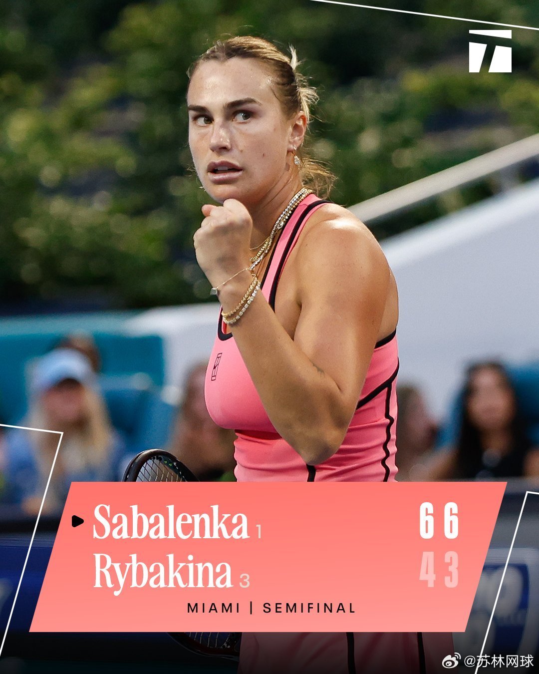 萨巴伦卡6-4/6-3莱巴金娜将两人战绩改写成10-7。第15次进入WTA 1000决赛。迈阿密的第11连胜。