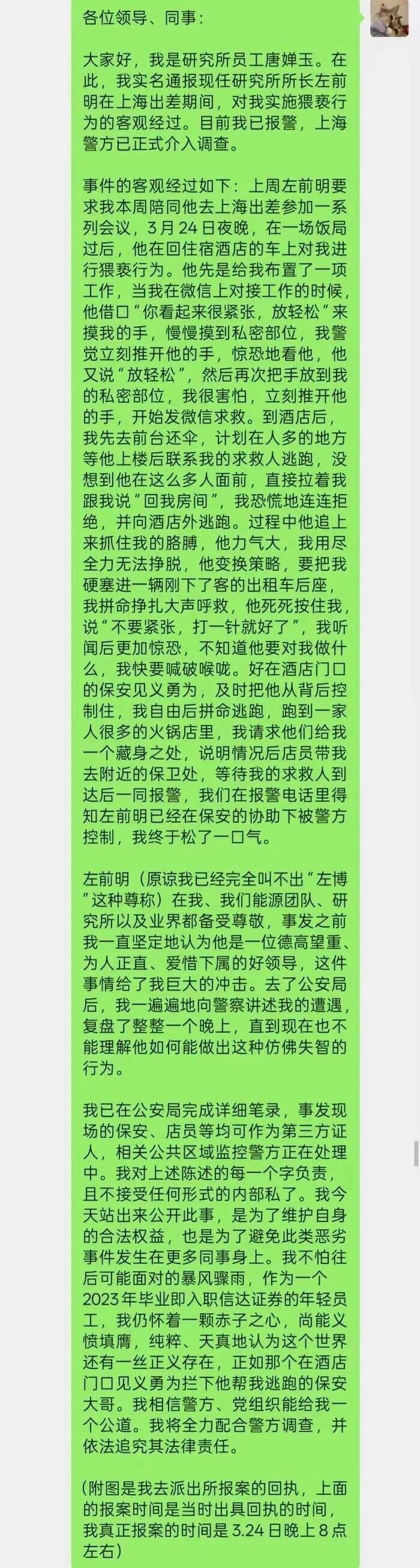 高学历≠高素质!信达证券所长左前明猥亵女下属被刑拘!言论严重超出正常人语言体系! 看完受害女下属唐婵玉写的实名举报信,真的越看越气愤!这件事和那些隐蔽的性侵案件情况完全不同,犯罪全程发生在公开场合,有监控、有保安制止、有目击证人,事实清楚,确凿无疑,完全没有狡辩余地! 当事人左前明,本硕就读于山东科技大学,博士毕业于中国矿业大学,事发前是信达证券研究所所长、能源首席分析师,在金融能源研究领域算得上资深人士。可就是这样一位高知精英,做出的事,说出的话,连普通人都干不出来,说不出口!3月24日上海出差期间,饭局后他在公开场合对女下属实施猥亵,试图强行将对方带走,女生拼命反抗呼救,幸好酒店保安及时出手制止,才让女生得以脱身。 尤其是那句“打一针就好了”,这话听着就感觉匪夷所思,不管是不是喝醉了说的酒话,都严重超出了正常人的语言体系。哪怕是个普通人,都不会说出这种流氓言论,更何况他还不是普通人,既是博士,又是所长。