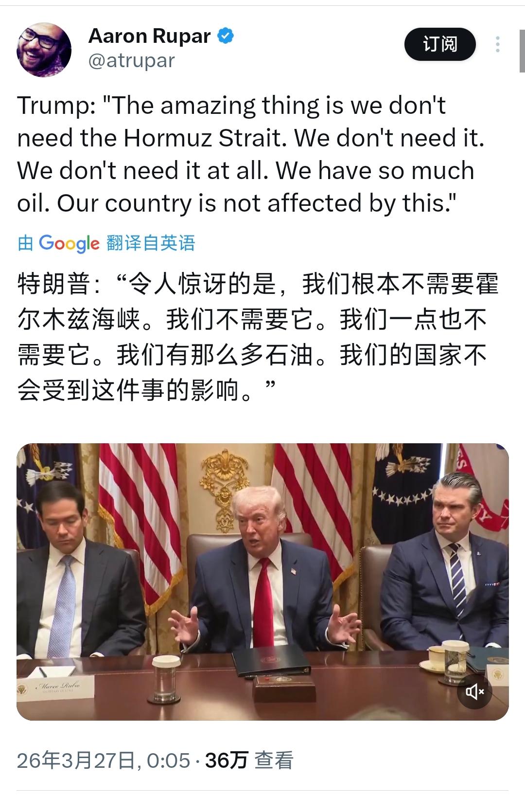 特朗普北京时间3月27日表示:“令人惊讶的是,我们根本不需要霍尔木兹海峡。我们不需要它。我们一点也不需要它。我们有那么多石油。我们的国家不会受到这件事的影响。” 首先得说清楚,霍尔木兹海峡到底是个啥地方,它可不是普通的海峡,全球好多国家的石油、天然气,都得靠这个海峡运出去。 根据官方数据,这个海峡是波斯湾通往外面的唯一航道,全世界通过轮船运输的石油,有四分之一以上都要从这过,还有差不多五分之一的液化天然气,也得走这条道。 就拿3月份来说,因为中东局势紧张,商船通过这个海峡的次数比之前少了95%,可见这个海峡有多重要,一旦它出问题,全球的能源供应都会受影响。 特朗普说美国有很多石油,不需要这个海峡,这话只说对了一半。确实,美国现在是全球第一大石油生产国,每天能产1330万桶石油,比沙特、俄罗斯都多,而且每天还能净出口210万桶石油,表面看确实不缺油。 但很多人不知道,美国自己产的石油,大多是轻质低硫油,而它国内的炼厂,几十年前就按中东的重质高硫油设计的,根本“吃不惯”自己产的油。 所以,美国每天还要进口近500万桶重质油,才能满足炼厂的需求,这些进口的石油,很多都要经过霍尔木兹海峡。 更重要的是,霍尔木兹海峡一旦出问题,比如被封锁,全球的油价就会疯涨,美国也躲不过去。有数据显示,国际油价每上涨10美元一桶,美国的物价就会跟着涨,老百姓加油、取暖的成本都会增加。 就拿最近来说,因为霍尔木兹海峡航运受阻,欧洲的天然气价格已经涨到了三年多的新高,美国也不得不临时放宽委内瑞拉和俄罗斯的石油出口限制,还暂停了相关航运法案,就是为了缓解油价上涨的压力,这明明就是受到影响了,特朗普却嘴硬说不受影响,这不是自欺欺人是什么? 再说,美国的盟友们,几乎都离不开霍尔木兹海峡。日本95%的石油都要经过这个海峡运输,欧洲从这个地区进口的石油、天然气,也占了自己总消费的30%到40%。 之前特朗普还号召盟友们一起派军舰,保障这个海峡的航行安全,可盟友们都不积极,只是表面应付,没人愿意真的投入力量。 特朗普见盟友不配合,就嘴硬说自己不需要这个海峡,其实就是拉不下脸,想装出美国很强大、不需要别人帮忙的样子。 还有,霍尔木兹海峡不只是运石油、天然气,还运很多化肥原料,比如全球近三分之一的尿素,都要通过这个海峡运输。 现在正是很多国家春季播种的时候,要是海峡一直受阻,化肥运不出去,化肥价格就会上涨,美国的农民也会受影响,种地成本会增加,而农民一直是特朗普重要的支持者,他不可能真的不在乎。 而且,美国的国防工业也需要从这个地区进口硫矿,海峡受阻,也会影响国防工业的产能。 更有意思的是,特朗普的言论前后都对不上。就在前一天,也就是当地时间3月26日,他还说不确定伊朗会不会遵守27日开放霍尔木兹海峡的期限,还说伊朗允许10艘油轮通过海峡,是给美国的“礼物”。 可到了27日,他就突然说自己根本不需要这个海峡,这话明显就是前后矛盾,说白了就是嘴硬,想掩盖自己的无奈。 大家都清楚,特朗普之所以这么说,就是想在公众面前装出美国很强大、无所不能的样子,想显示自己的强硬。 但实际情况是,美国根本离不开霍尔木兹海峡,不管是自己的炼厂需求、国内物价稳定,还是盟友的利益,都和这个海峡紧密相关。 现在霍尔木兹海峡因为局势紧张,航运已经受到了很大影响,美国已经开始增兵中东,还计划派航母打击群过去,这就足以说明,美国其实比谁都在乎这个海峡的安全。 特朗普的这番话,说白了就是自欺欺人,嘴上喊着不需要,实则无视这个海峡的重要性,就是想嘴硬撑场面。 要知道,霍尔木兹海峡是全球能源的关键通道,只要它出问题,全球经济都会受影响,美国也不可能独善其身。 美国不是不需要霍尔木兹海峡,而是不敢承认自己的依赖,怕丢了面子。特朗普反复强调“不需要”,不过是想掩盖自己应对中东局势的无力,想安抚国内民众的情绪。 但事实就是事实,霍尔木兹海峡的战略意义摆在那里,不是他嘴硬就能否定的,美国只要还想维持自己的全球影响力,还想保障国内的能源稳定和物价稳定,就不可能真的脱离这个海峡,他的这番荒诞言论,终究只是自欺欺人罢了。