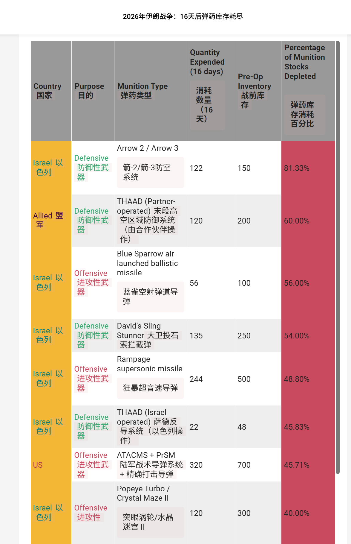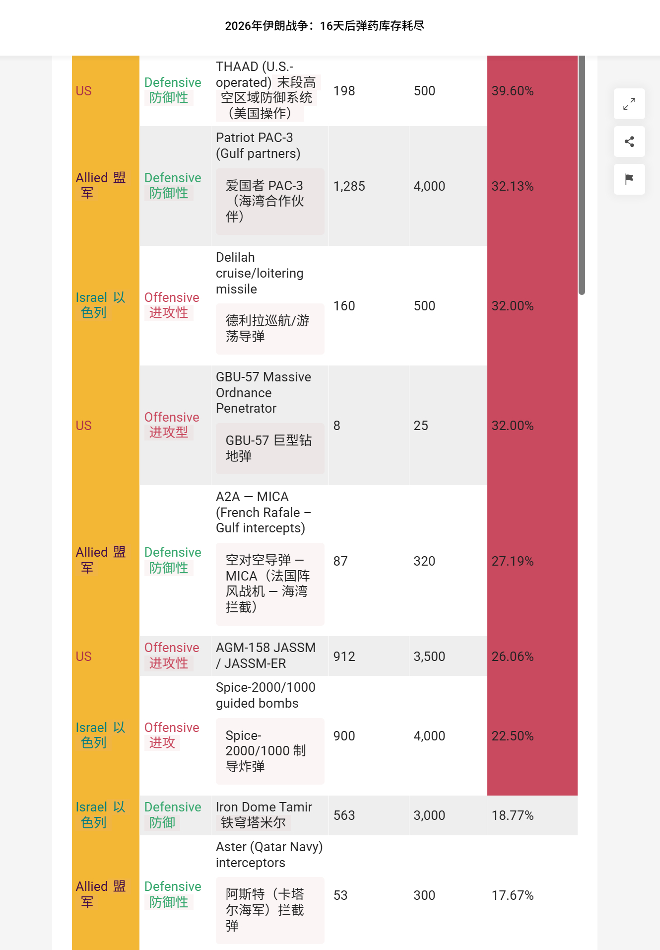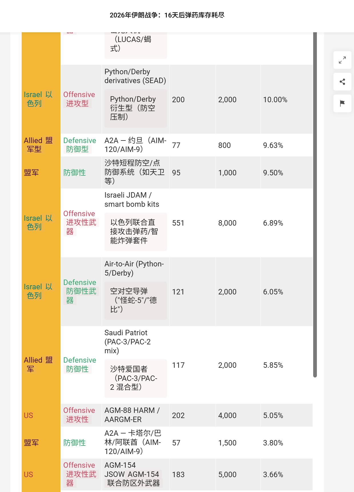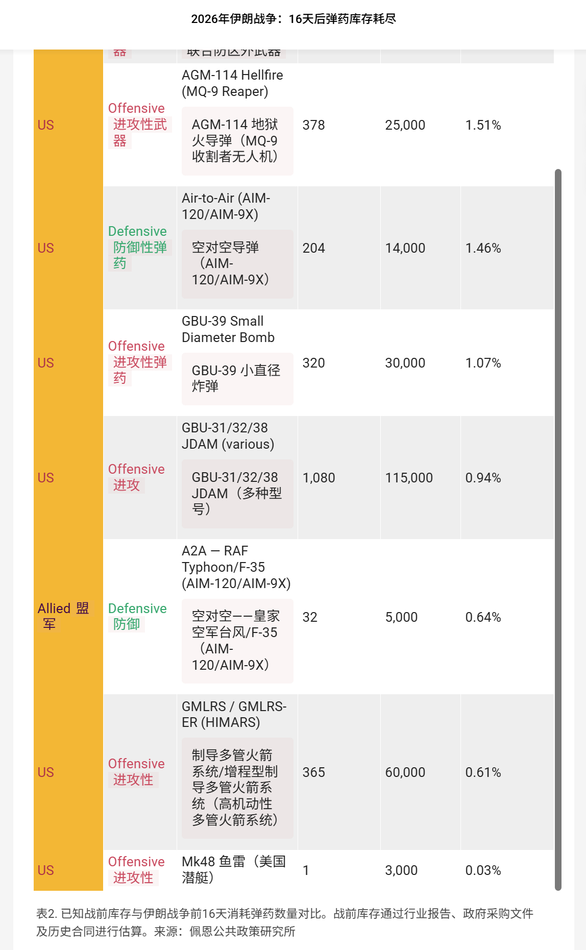 🔻来自英国皇家联合服务国防与安全研究所 RUSI 的伊朗战争弹药消耗估算。🔻不知道数据来源是啥,大家看个热闹,至少 LUCAS 的数量可能就不对。🔻这个数据称:海湾国家共发射1,285枚 爱国者PAC-3导弹,库存消耗达32.13%(基于约4,000枚库存),美军额外动用402枚 PAC-2和PAC-3导弹。🔻联军共发射340枚 THAAD(萨德)反导系统拦截导弹,其中美国198枚、合作伙伴120枚、以色列22枚。🔻美国海军动用431枚宙斯盾系统的SM-2、SM-3和SM-6防空导弹。🔻美军还发射535枚战斧巡航导弹、912枚联合空对地导弹(JASSM),以及320枚 ATACMS和PrSM、 8 枚 GBU-57 钻地炸弹等。🔻英国皇家联合服务研究所(简称 RUSI)是全球历史最悠久的国防与安全智库,由第一代威灵顿公爵于 1831 年创立,总部位于英国伦敦白厅。现任主席为第九代威灵顿公爵,总干事为瑞秋·埃勒胡斯,高级副总干事包括大卫·彼得雷乌斯。伊朗正式回应美国15点停火协议伊总统称伊朗致力于全面结束战争海外新鲜事中东现场直击