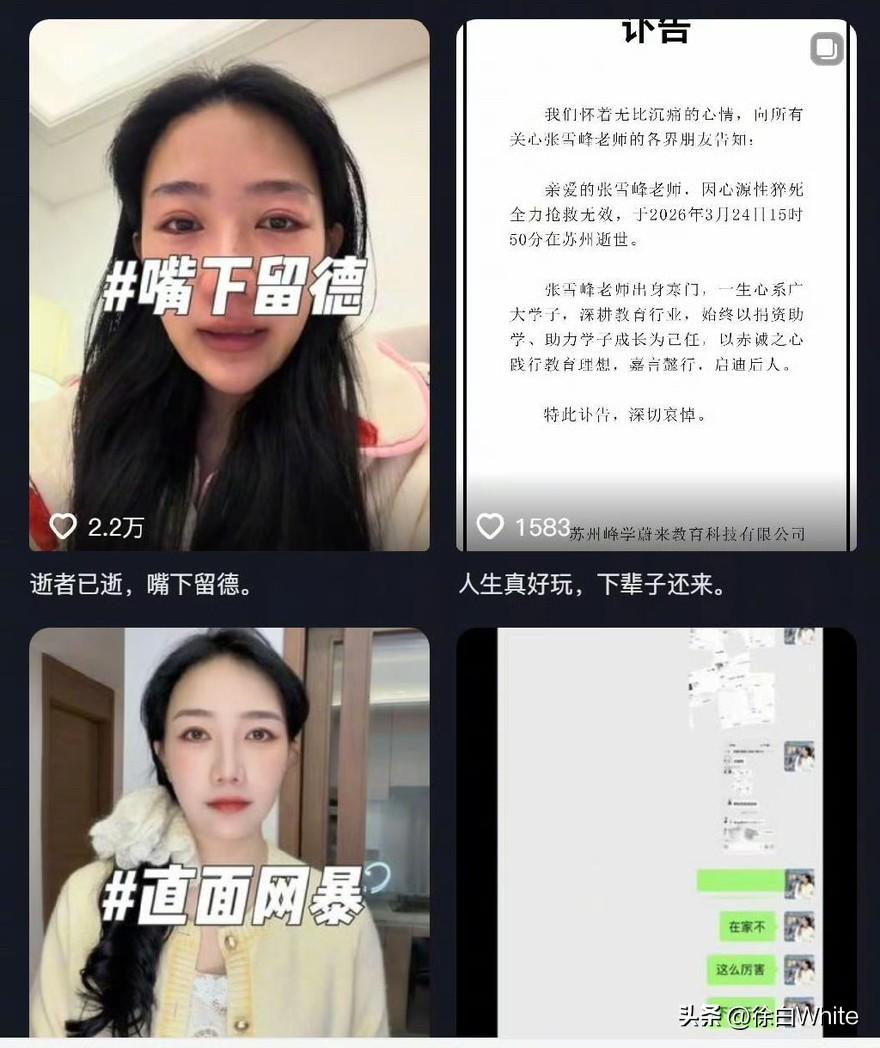 3月27日,关于他,关于她,关于他们 这两天一直看到她的消息,有一说一,觉得她这个时候不太适合出来诉说他跟她的故事,如果她这时候没有冒头,可能并没有太多人知道她,并对她产生质疑…… 这时候突然跳出来说这些,只会让大家觉得她另有所图而已,对于她自己来说,并没有任何好处,因为没有人会在这个时候,认真,耐心,中立的听她讲他跟她的故事! 也没有人会在这时候认真的去核实事情的真伪,与其如此,给自己增添困扰,给他带来不安宁,不如选择安静的对他进行哀悼……