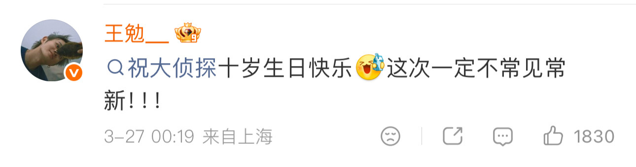 王勉许愿不再常见常新十年侦心不改,美好如约而至。王勉为大侦探十周年送上真挚祝福,