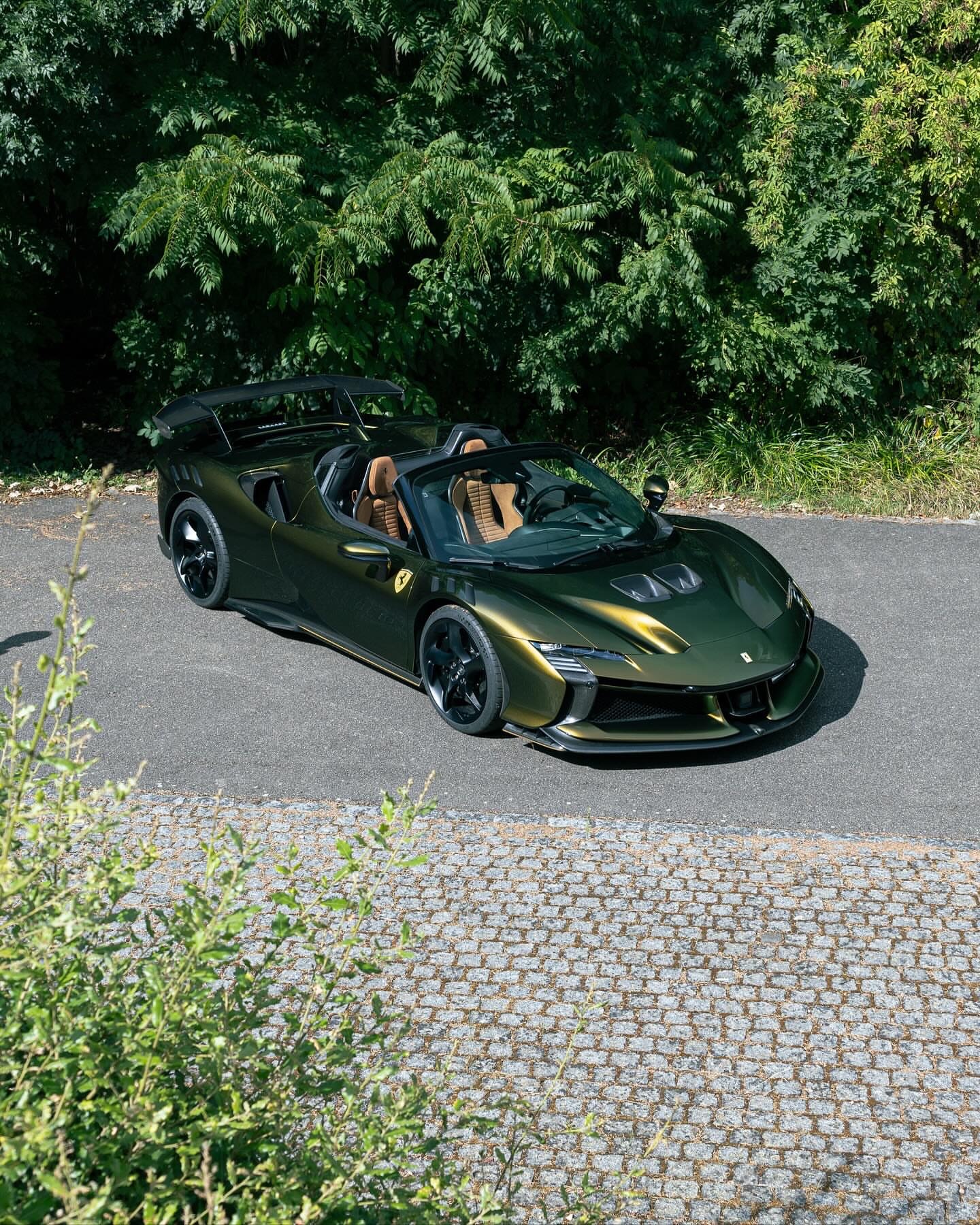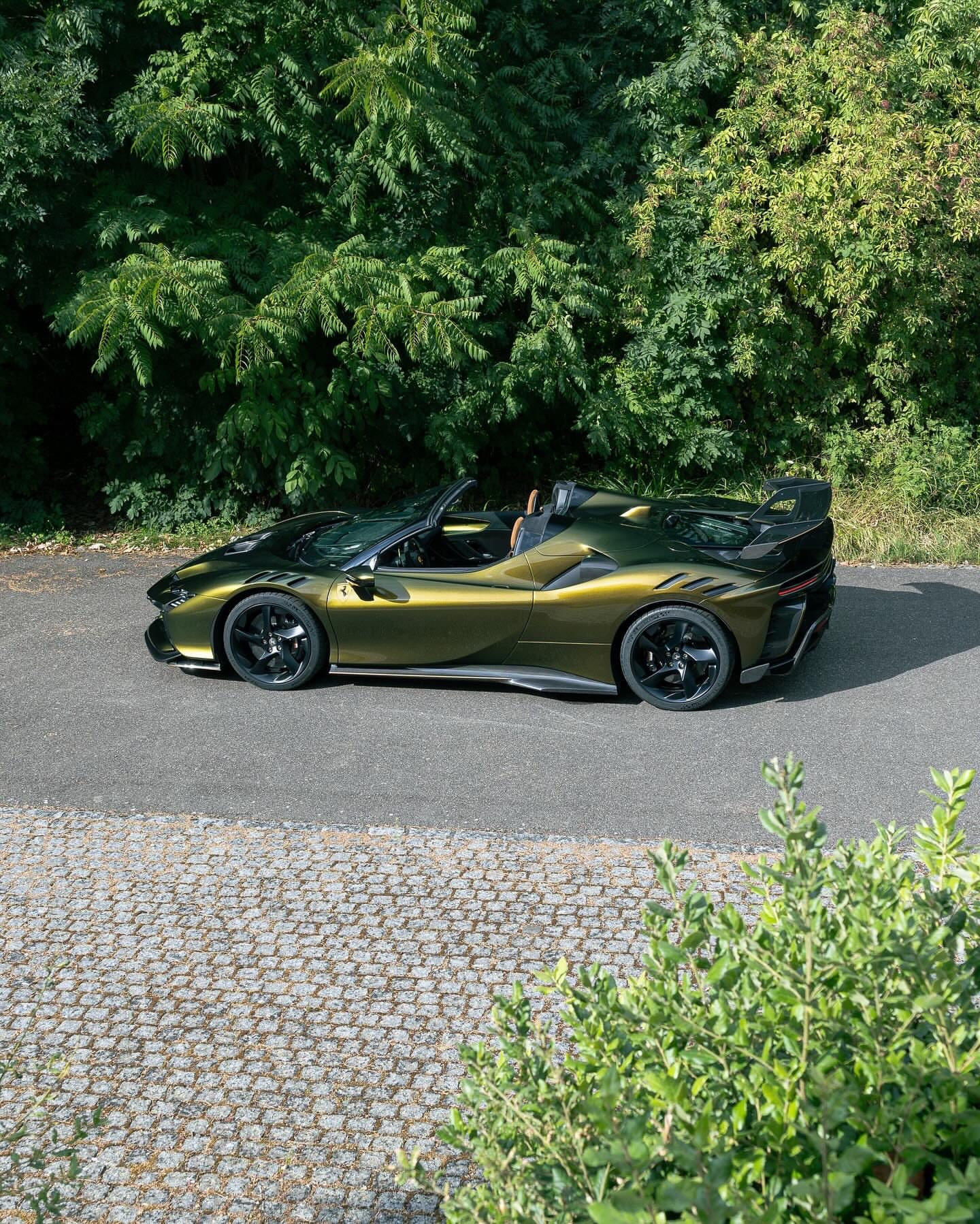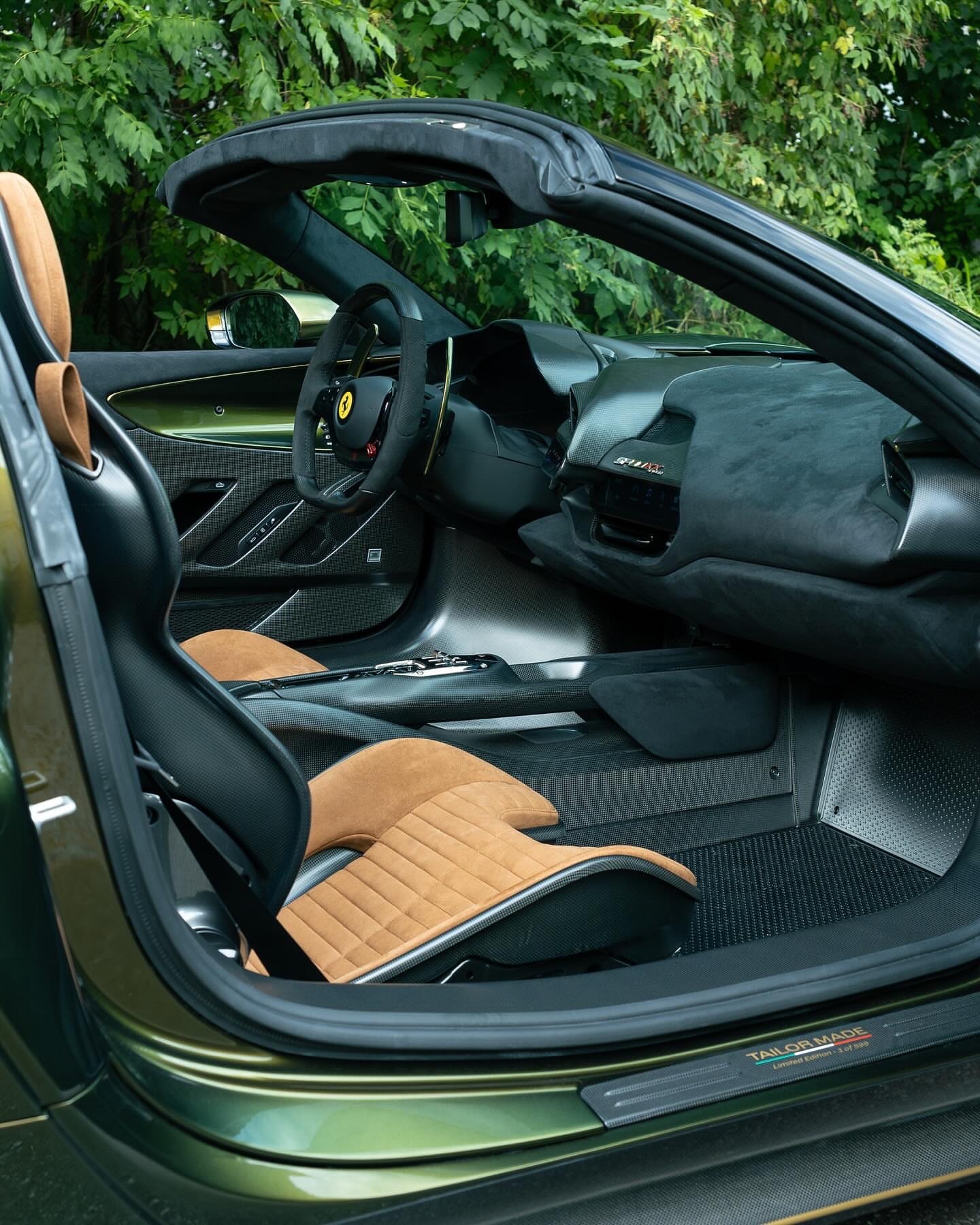 定制款 SF90 XX Spider。这款 SF90 XX 采用的是首次在 Tailor Made Cavalcade 系列中亮相的“维特拉绿”车漆,车身下部带有“金属金”色的梦幻线条。内饰为黑色 Alcantara 材质,搭配带有水平条纹的“红褐色 Revo Alcantara 碳纤维”赛车座椅。