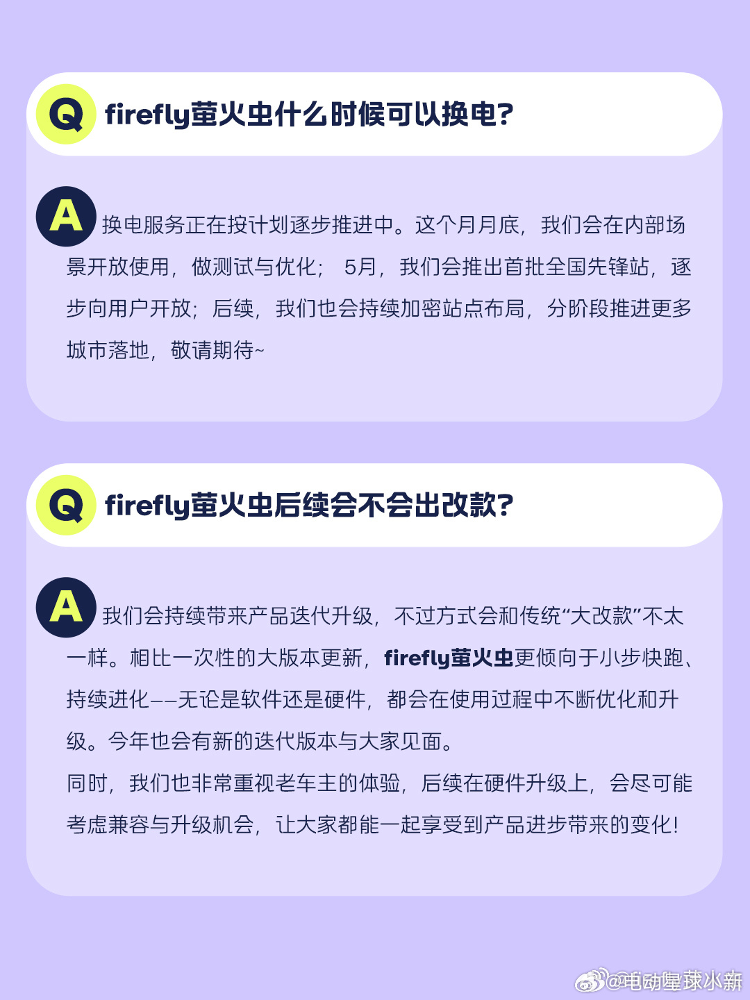 firefly 萤火虫最新的问答回答了关于换电和改款的问题