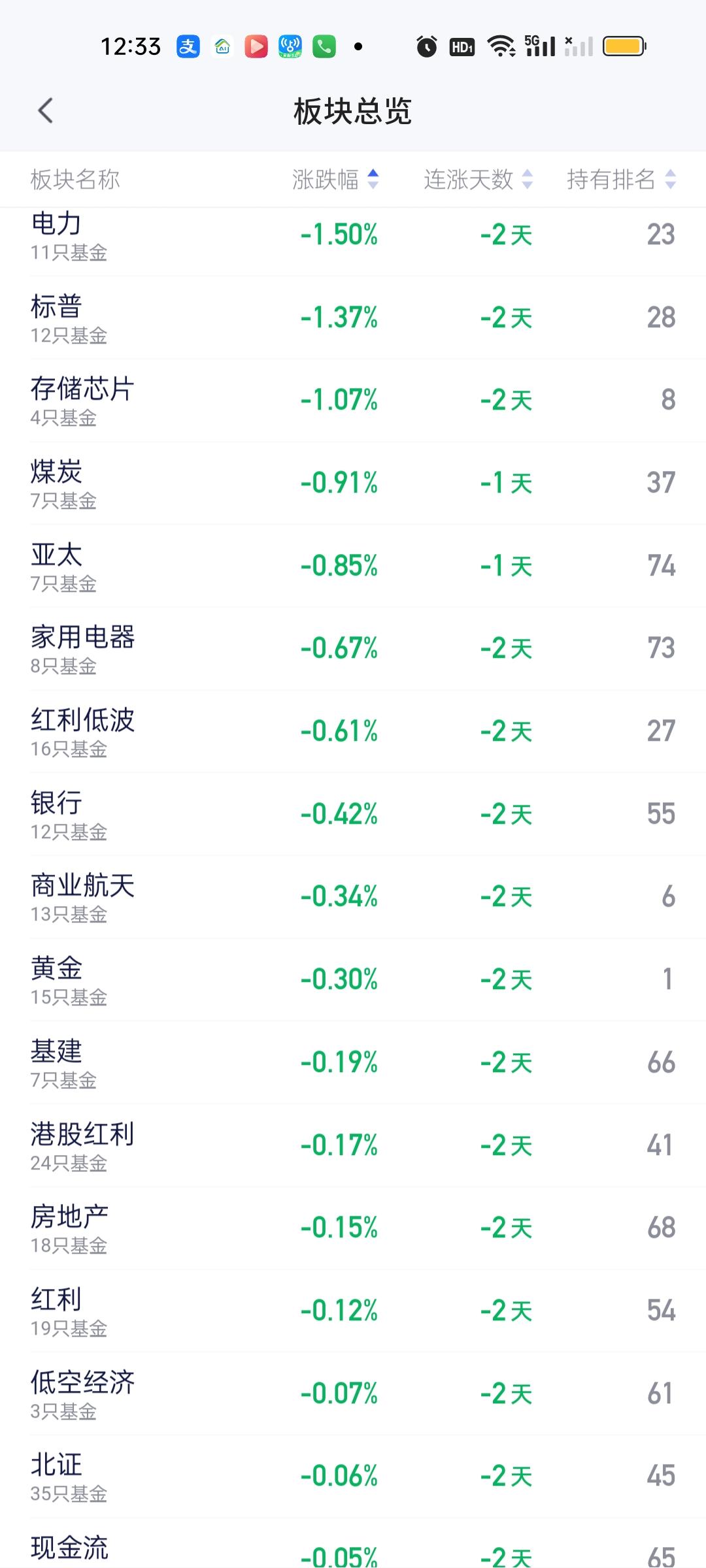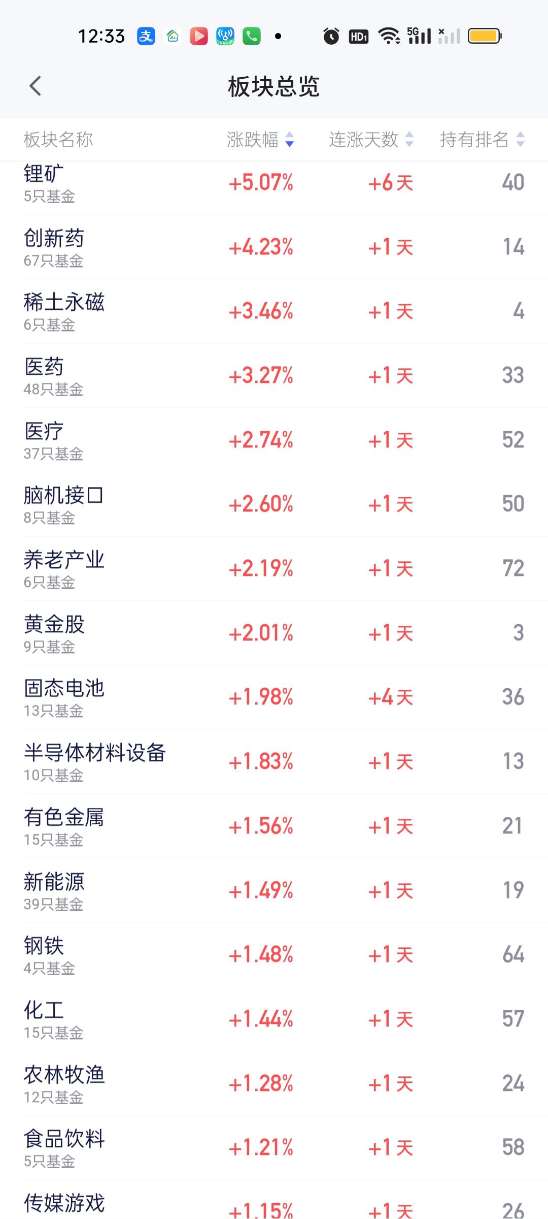 从中午收盘后的板块榜来看。涨幅最大的是锂矿,创新药,稀土永磁和医药,其中锂矿的涨幅的超过了5%,创新药也有4.23%,稀土永磁和医药也都超过3%,涨幅在2%以上的还有医疗,脑机接口,养老产业和黄金。跌幅方面,电力,标普,存储芯片和煤炭,跌幅居前。