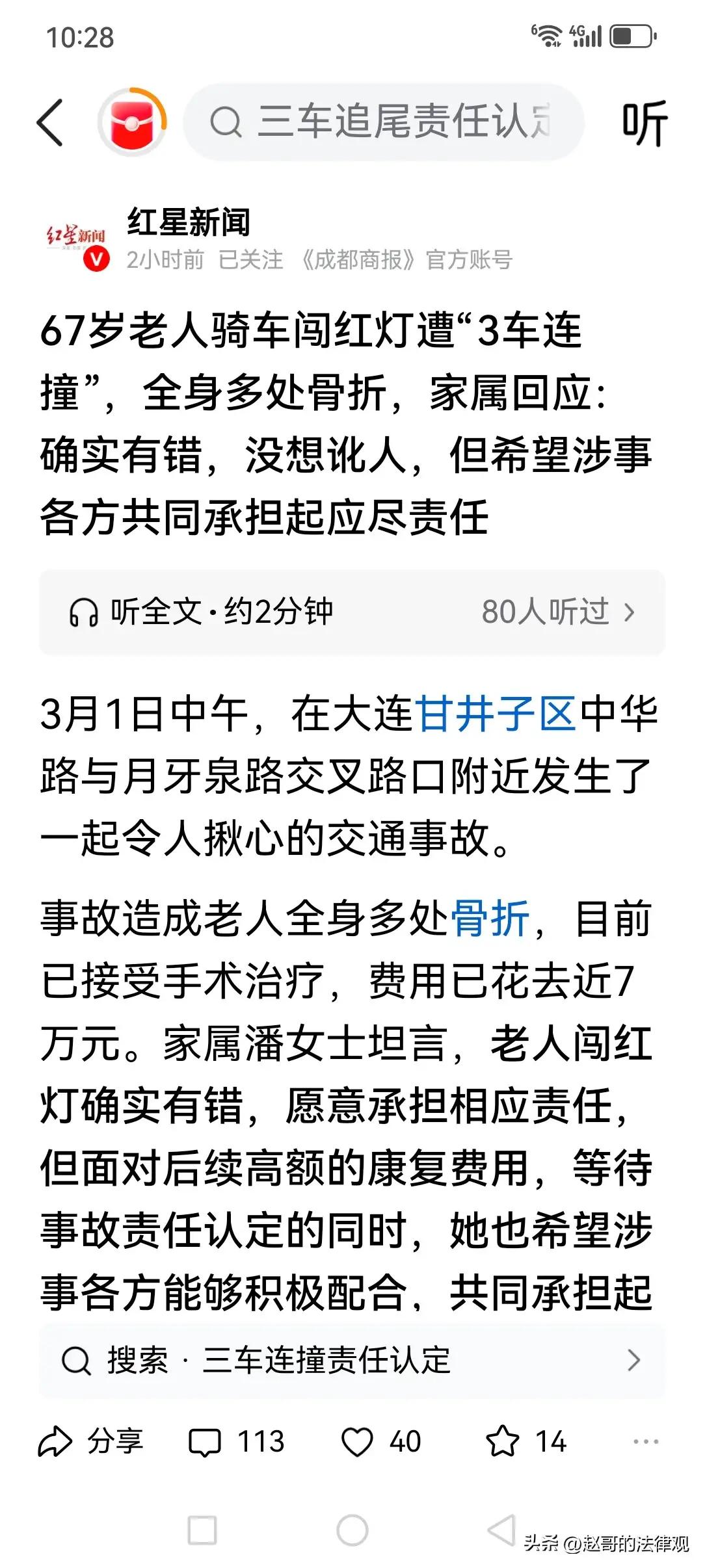 三车连撞后的理性之光:守规则是底线,担责任是担当 今儿咱们单说一桩发生在大连街头的“惊魂一刻”。这事儿,听着像“生死时速”的电影桥段,实则是一记敲在所有人脑门上的“安全警钟”。67岁的潘大爷,骑着车在路口“连闯三关”,结果被三辆车“接力”撞上,全身多处骨折,手术费花了七万多。这本是一场“飞来横祸”,却因家属的一番话,成了“人间清醒”的教科书。 想当年,咱们总觉得“老人是弱势群体”,出了事总有人“和稀泥”,甚至“谁弱谁有理”。可潘大爷的家属却“掷地有声”:闯红灯有错,我们认;没想过讹人,只希望各方担起应尽的责任。这态度,比那些“撒泼耍赖”的强了百倍!监控里,大爷第一次被撞后“慌了神”,继续往前骑,这才酿成后续的惨剧。这哪是“意外”?分明是“无视规则”的代价。交通规则不是“摆设”,红灯停绿灯行,这是“铁律”,不是“选择题”。 但这“理性”的背后,藏着的正是咱们今天要说的“大健康”格局。真正的健康,讲究“内外双调”。外在,咱们得学会“敬畏规则”,别让那“侥幸心理”成了生命的“定时炸弹”,遵守交规,就是对自己最大的负责;内在,这“感恩之心”更是不可或缺。我们要感恩这“家属的坦诚”,是他们让“责任”二字不再模糊;更要感恩这“法治的公平”,它让我们明白,无论是强者还是弱者,都要在规则面前“一视同仁”。这种“明辨是非”的通透,才是滋养社会肌体的“灵丹妙药”。 我们要感恩这“事件的警示”,它虽带着伤痛,却让我们在一次次反思中,推动着文明的进步。 愿世间少一些“闯红灯”的侥幸,多一些“守规则”的自觉。 愿你我皆安康,前程皆似锦!