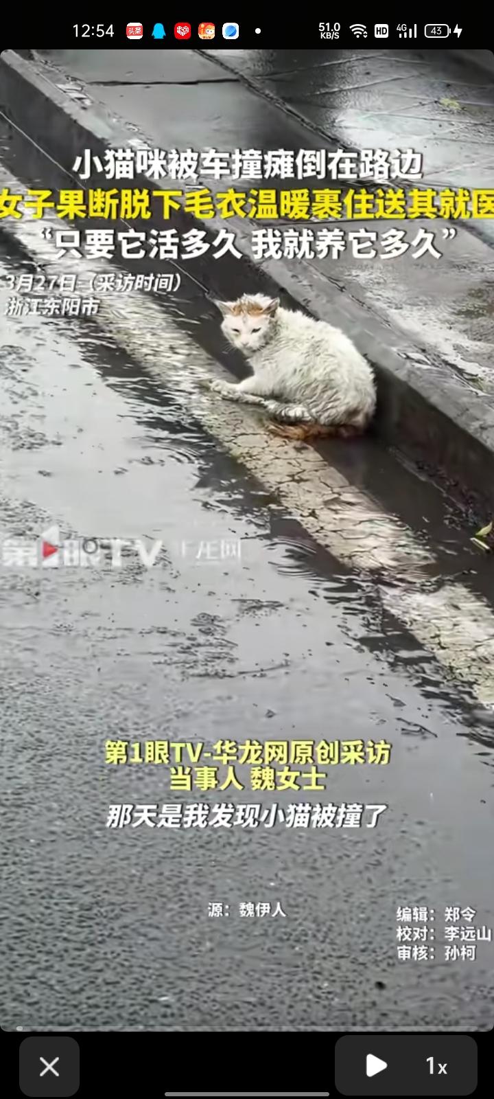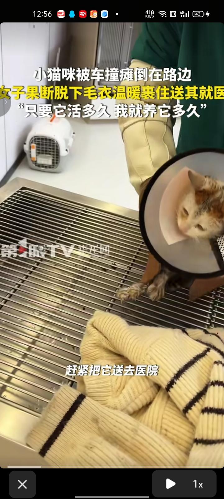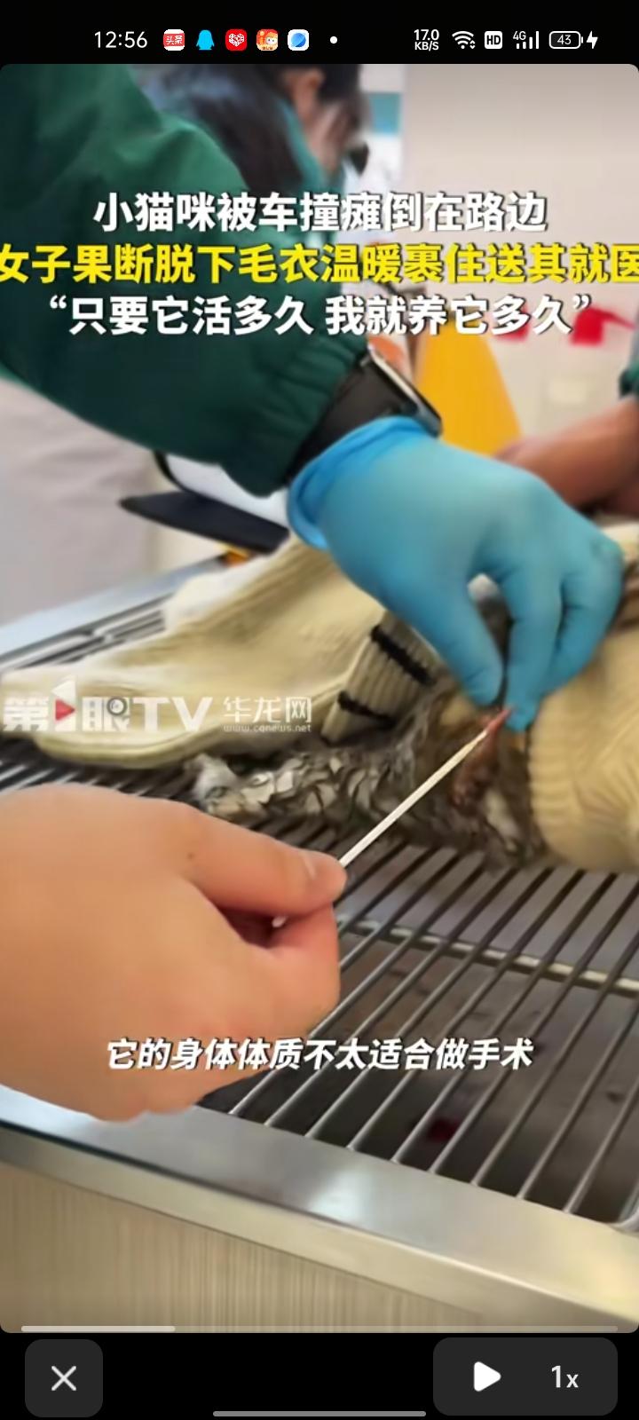 3月26日,金华东阳市。女子发现小猫被车撞了,瘫倒在路边,随后她果断脱下毛衣裹住送它就医。经医生诊断,小猫的左腿关节裂开了,它的身体体质不太适合做手术,就给它打了止血针、消炎针和止痛针。 当事人魏女士表示,这只猫咪有猫瘟,牙龈发白,体质不好。医生说猫咪可能这几天坚持不住走了,也有可能活很久。现在自己每天都带它打针输液,能活几天就治疗几天。