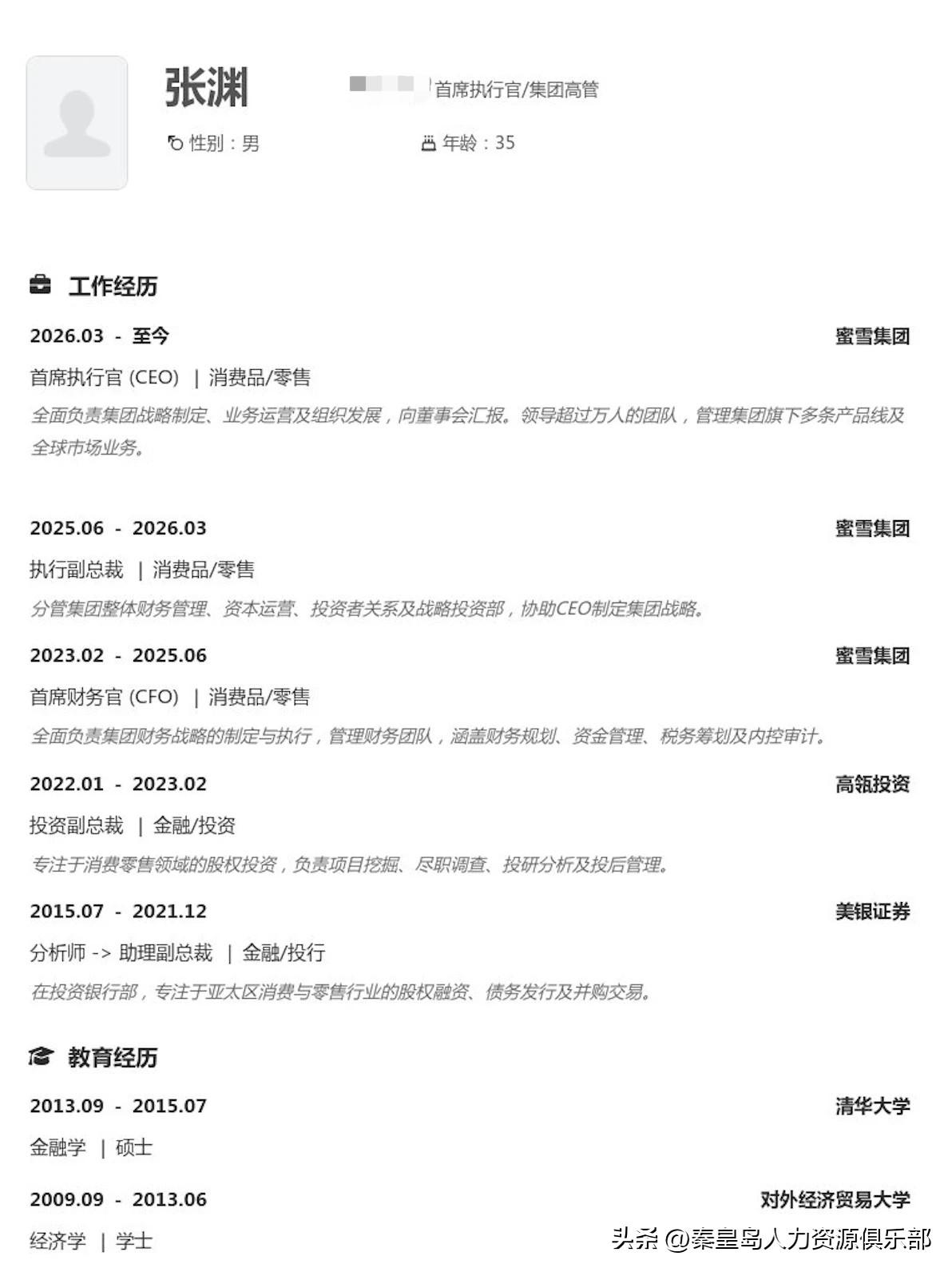 35岁当蜜雪冰城CEO,年轻人张渊接任蜜雪冰城CEO。很多人一看年龄:嚯,才35岁!再一看简历,清华大学硕士,干过高瓴投资、美银证券,一进蜜雪就从CFO干到CEO,两年多带着企业搞资本运作、找新增长点,硬生生把三百亿营收的公司接手里了。要我说,这就是“能者上”! 有人说,35岁不是职场危机年龄吗?怎么人家就当上一把手了?要我看,职场上别老盯着岁数、资历那些虚的,关键还得看真本事。张渊这例子就说明,只要能力够硬,年龄根本不是坎儿。蜜雪冰城敢用这么年轻的掌门人,说明人家企业看得明白,知道在现在这市场里,有闯劲、懂新东西的年轻人更能带企业往前冲。 咱们职场人别光羡慕,也得琢磨琢磨。别动不动就觉得自己“到这个岁数没戏了”,得多看看自己手里有啥硬技能,有没有不断学习。这个时代,机会还是很多的,就看你有没有那两下子。张渊能上去,那是实打实干出来的。咱们也可以,对吧?加油干,别设限!