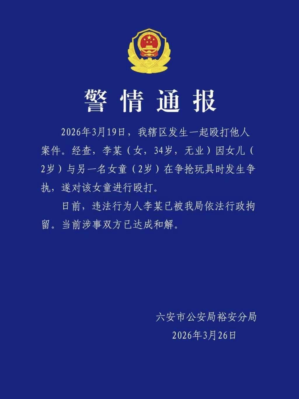 最近有个事儿看得人特别来气。在安徽六安,一个当妈的,因为小孩之间闹了矛盾,竟然动手把别人家两岁的孩子打到骨折。 这事儿是3月26号,六安裕安警方发的通报。但之前网上就传开了,有视频,看着更揪心。视频里,那个打人的女家长,自己怀里还抱着个娃,蹲下来就抓着那个穿黑衣服的小孩的手,使劲打,孩子当时就疼得大哭。后来医院一查,结果更吓人:孩子耳朵里有点出血,脑袋、肩膀上好多个地方都肿了、青了,最严重的是右手的手指头,骨头都折了。病历上清清楚楚写着,这孩子才两岁。 看完就一个感觉,这当家长的,火气也太大了。两岁的小孩,他能懂多少事?小孩之间抢个玩具、闹点别扭,再正常不过了。大人要做的,是拉开,是讲道理,是教自己孩子怎么跟别人相处。这可倒好,你自己上手,用成年人的力气去打一个两岁娃娃,这已经不是护犊子了,这纯粹是欺负人,是犯法。 而且你仔细想想,她这么干,真是在给自己孩子“出气”吗?恰恰相反,她这是给自己孩子做了个最坏的示范。孩子学到的不是如何处理冲突,而是“谁拳头硬谁有理”。以后她自己的孩子遇到事,是不是也学会用暴力解决了?这哪是爱孩子,这是害孩子。 现在警方通报了,事情在依法处理。希望这个被打的两岁宝宝,身体上的伤能快点好,更希望这心理上的惊吓,家里大人能好好安抚。至于那个打人的家长,该承担的法律责任,一点都不能少。都是当父母的人,将心比心,你怎么下得去手?这件事也给所有家长提了个醒,管好自己的情绪,比什么都重要。你的“一时冲动”,毁掉的可能是两个孩子。