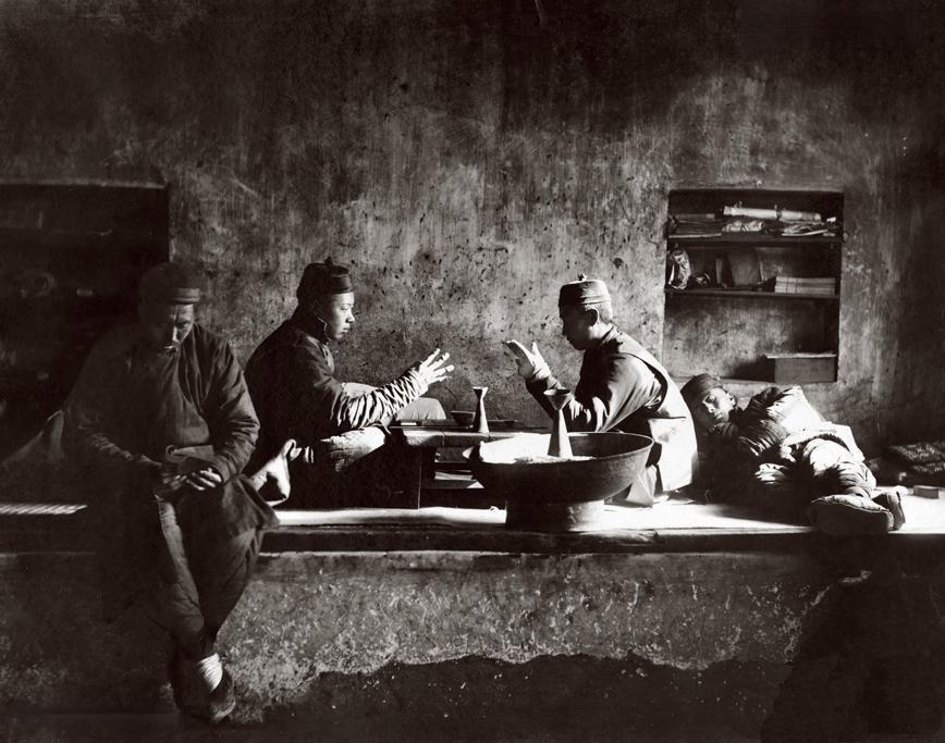 晚清冬日,昏暗破败的土房里,几名男子围坐在炕边,右侧男子斜躺在炕上,神情萎靡,中间两人正对着划拳,左侧男子蜷缩低头,尽显憔悴。