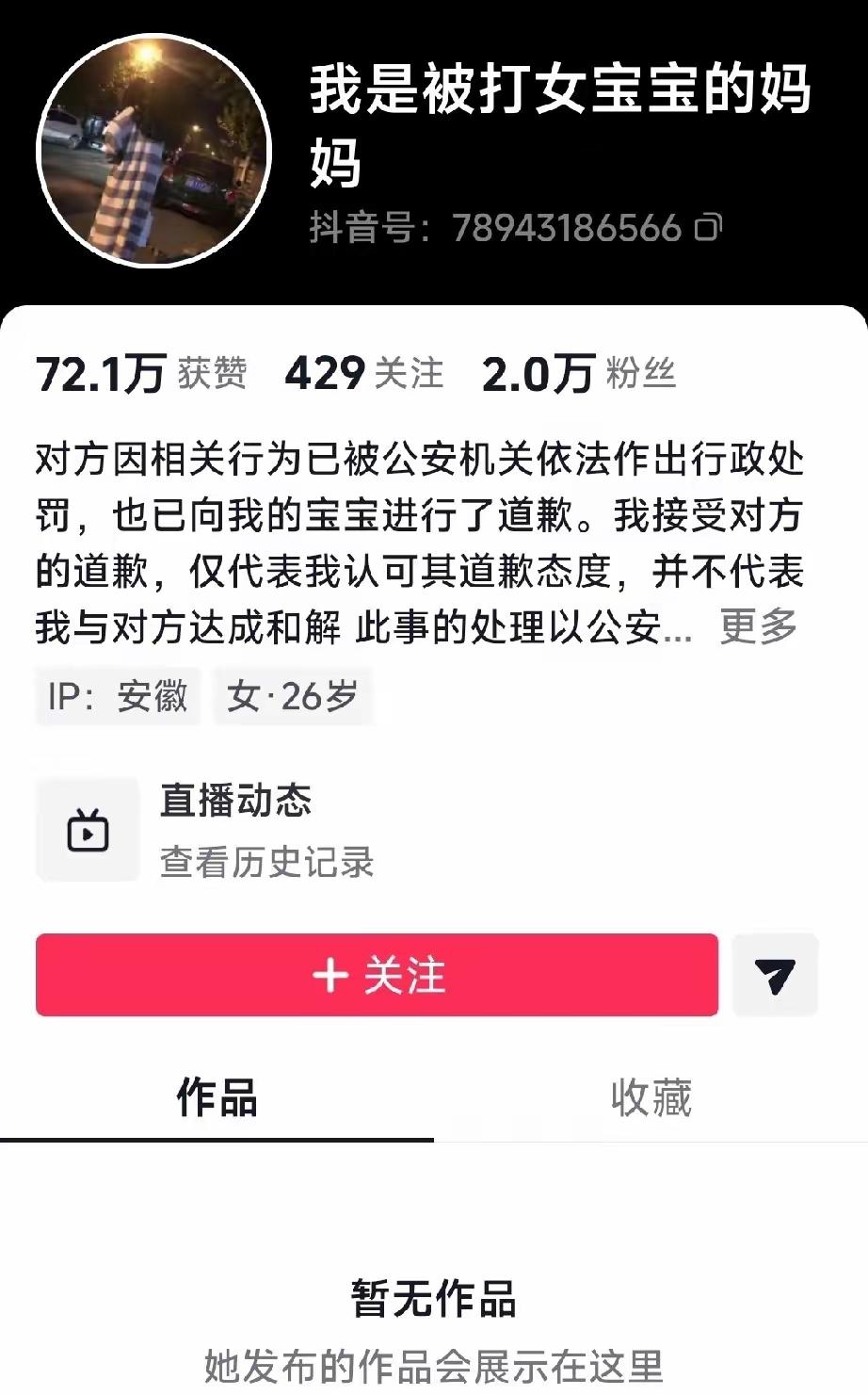 六安2岁女童被打,孩子妈说没有和解,官方通报却说已经和解了!!! 两个小朋友抢玩具车,没想到抢人家车的小孩家长直接情绪失控,对着无辜的两岁孩子大打出手,下手特别狠。 被打孩子妈妈把视频发到网上,一下子引来很多关注,网友全都支持她为孩子讨公道。 事后打人女子还带了十几个人跑到受害者店里,想拿1000块钱私了,被打孩子妈妈直接拒绝,说坚决不要一分钱,坚决不私了。 结果没过几天,官方通报说双方已经和解了,被打女童妈妈也把相关视频全删了。可她在简介和评论里回复,说自己并没有和解,只是接受了对方的道歉,也觉得打人的已经被拘留,受到了应有的惩罚。 这事也就这么结束了,网友慢慢也会淡忘。但要是后续这位妈妈借着这个热度直播卖货、变现,肯定会被网友骂的!