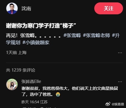 张雪峰老师,谢谢你来过,谢谢你照亮了那么多人的路。愿天上的文曲星,能好好歇一歇;也愿小朋友能带着爸爸满满的爱,平安、快乐、顺遂地长大,永远被世界温柔以待💖