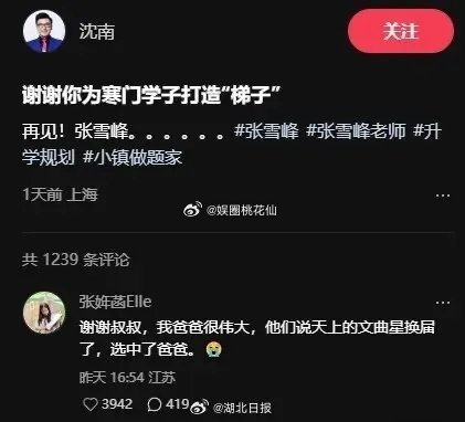 这是张雪峰女儿张姩菡在沈南的悼念视频下缅怀父亲时说的一句话。孩子不懂大人的世界,她只知道爸爸很伟大。