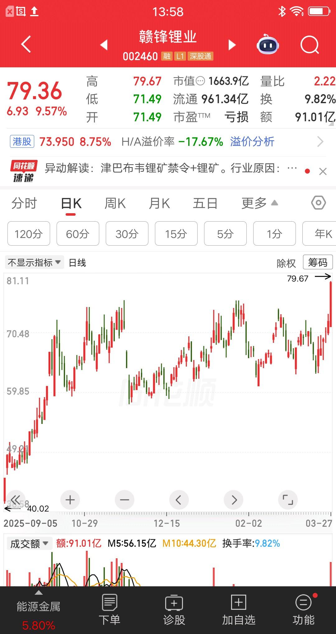 A股今天人气最高的票诞生了,赣锋锂业冲到热股榜第一位,把电力龙头华电辽能比下去了,太牛了。赣锋锂业开盘后,先是横盘震荡了约一个小时,然后股价突然起飞经过持续的拉升,在涨幅5到6个点停下了。休整一段时间后,股价再度拉升,这次干到涨停,迅速吸引了大量散户的关注。 日线看,股价在高位反复震荡,足足有好几个月的时间。今日一根大阳线向上突破,刷新股价新高。 目前来看,赣锋锂业的主跌浪还没开始,但是该来的总会来。因此别去追高,挂在山顶很惨的。即便要去博弈,也只能是短线操作,千万不要做中长线。