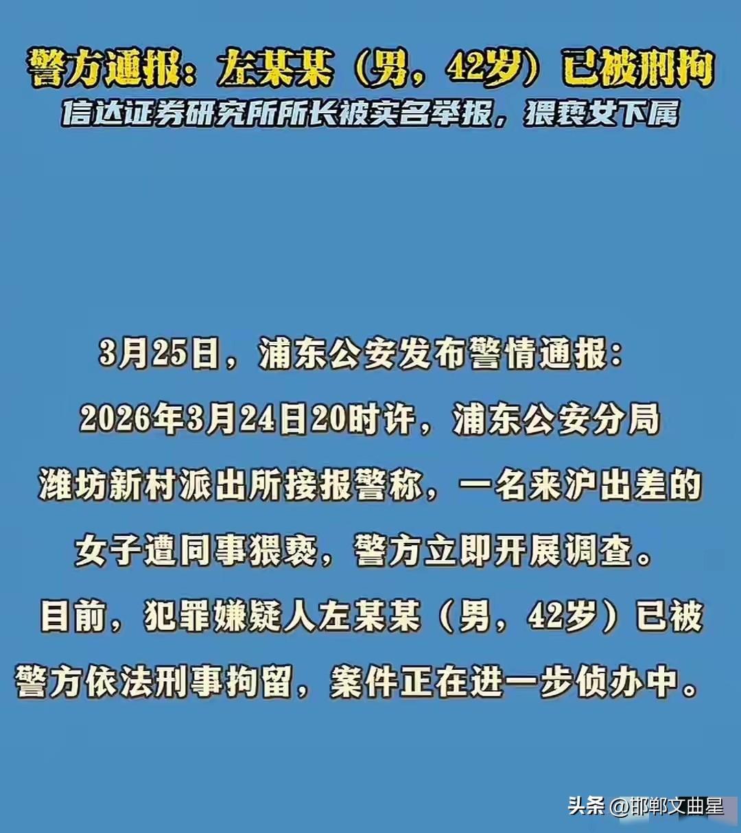 “打一针就好了!” 近日,某证券所左所长这句令人作呕的“名言”,遭到网友们的一致谴责。 左所长以开会为由,邀请所里的女研究员唐女士一同前往上海出差。没想到在饭局后回酒店的路上,他竟对唐女士动手动脚,这让唐女士十分紧张。碍于左所长的权威,她不敢强烈反抗。然而,左所长却变本加厉,“安慰”唐女士道:“不用紧张,打一针就好了!”这句含义隐晦的话,让唐女士十分气愤。于是,当左所长再次对她实施猥亵时,她果断报警。警方接警后迅速将左所长带走,并依法刑事拘留。 不得不说,唐女士真的很勇敢。 从左所长说的这句话可以推断,他或许不是第一次对其他女性说这样的话。其他女子可能迫于他的权威,默默承受了这种伤害。而唐女士不同,她长相出众,又是刚晋升的研究员,还得到了左所长的支持,但她不接受职场中的这种潜规则。 左所长可能没想到会遇到唐女士这样刚烈的女子。所以,当他故技重施时,就栽了! 有人说,漂亮女孩不要进金融圈,其中的含义不言而喻。 既然有这种说法,说明这种风险确实存在。 但是,只要能像唐女士一样勇敢,不管是左所长还是右所长,都会受到法律制裁,因为法律面前人人平等。 对此,大家怎么看?