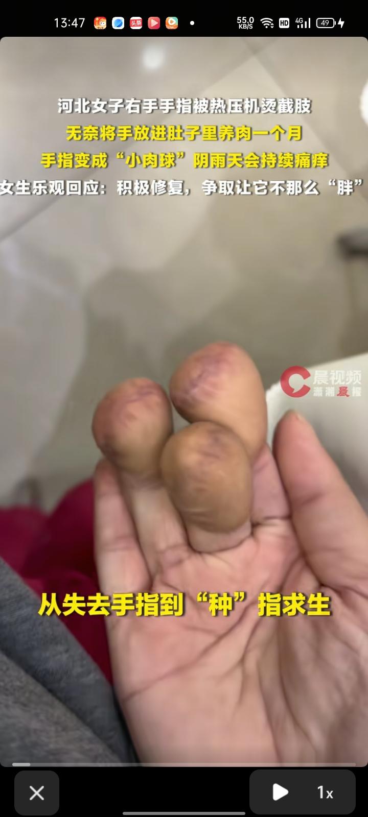 近日,河北沧州。女子晒出“小肉球”手指引发网友关注,从失去手指到“种”指求生,再到笑着面对伤痛。 当事人卢女士介绍,去年夏天,右手被热压机烫伤导致截肢,为再造手指,必须将手指放在肚子里养肉一个月,拿出来就成了现在胖胖的样子,每到低温阴雨天,手指会出现幻肢痛和瘙痒。经过网友们的鼓励,让她能积极走出阴影,后续会持续修复,尽量让她恢复成正常形态 一次意外,一场重生,胖胖的手指背后,是咬牙坚持的日夜。幻肢痛挡不住向前的脚步,网友的温暖照亮了前行的路。卢女士笑着面对伤痛的模样,让我们看见:真正的强大,从来不是不曾受伤,而是受伤后依然选择热爱生活。