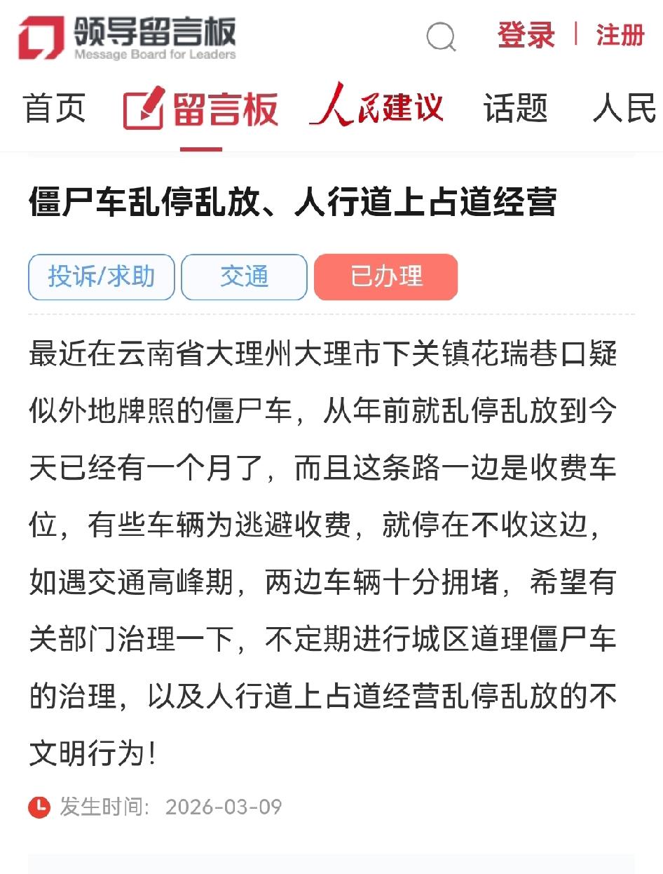 大理网民反映华瑞市场疑似外地牌照的僵尸车辆违停的问题 3月9日网民通过人民网领导留言板给大理州委书记留言 僵尸车乱停乱放、人行道上占道经营 最近在云南省大理州大理市下关镇花瑞巷口疑似外地牌照的僵尸车,从年前就乱停乱放到今天已经有一个月了,而且这条路一边是收费车位,有些车辆为逃避收费,就停在不收这边,如遇交通高峰期,两边车辆十分拥堵,希望有关部门治理一下,不定期进行城区道理僵尸车的治理,以及人行道上占道经营乱停乱放的不文明行为! 发生时间: 2026-03-09 2026-03-25 19:00 大理市公安局交通警察大队官方回复 网民同志:您好! 您通过人民网领导留言板给大理州委书记的留言收悉,我们高度重视,第一时间转送相关部门开展调查核实,现将办理情况回复如下: 关于您反映“华瑞市场车辆违停”的问题,经大理市公安局调查核实,华瑞市场通道设有两车道,靠南侧设有停车泊位,由于该通道附近有小学且餐饮店较多,确实存在车辆随意停放、影响群众出行安全的问题。 根据您反映的僵尸车问题,大理市公安局及时进行摸排,和车辆所有人取得联系,车主表示在附近上班,车子停在停车泊位上,不影响其他车辆通行。大理市公安局将持续跟进,对该路段不定时摸排,消除长期占用道路资源的安全隐患。 结合该路段的实际情况,大理市公安局建议取消该路段停车泊位并安装中隔离栏,杜绝车辆违停。但周边均是老旧小区,停车泊位配套严重不足,考虑到周边居民的日常需求,方案已报市级相关部门进行可行性研究。同时大理市公安局也会增加警力,加强管理,定时与不定时对该路段巡逻管控,为群众出行提供有利条件。 感谢您对我们工作的理解和支持,祝您身体健康,生活愉快!