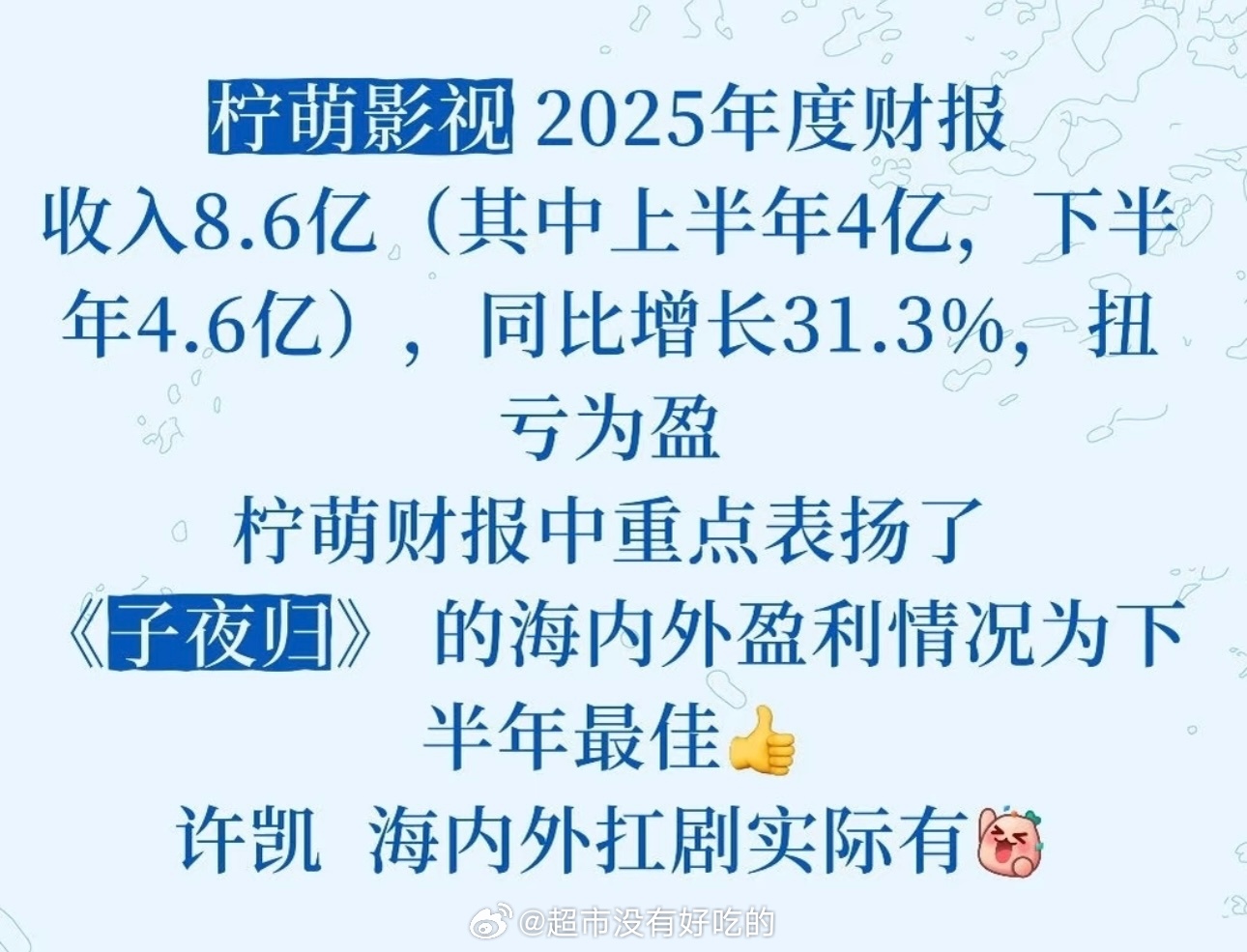 柠萌25年财报夸了许凯子夜归海内外盈利柠萌25年收入8.6亿,子夜归被多次点名表扬许凯海内外剧粉盘太大了,凯凯好优秀许凯许凯