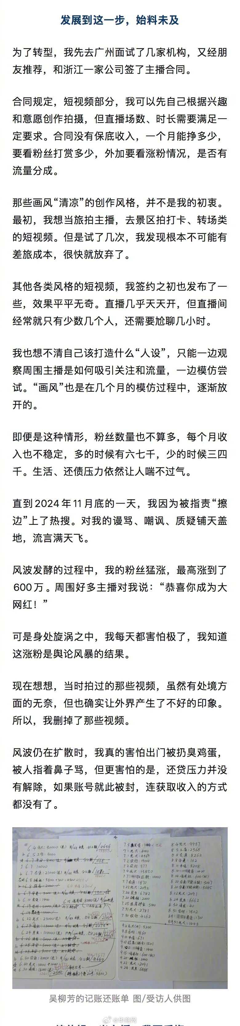 即便是这种情形,粉丝数量也不算多,每个月收入也不稳定,多的时候有六七千,少的时候三四千。生活、还债压力依然让人喘不过气。