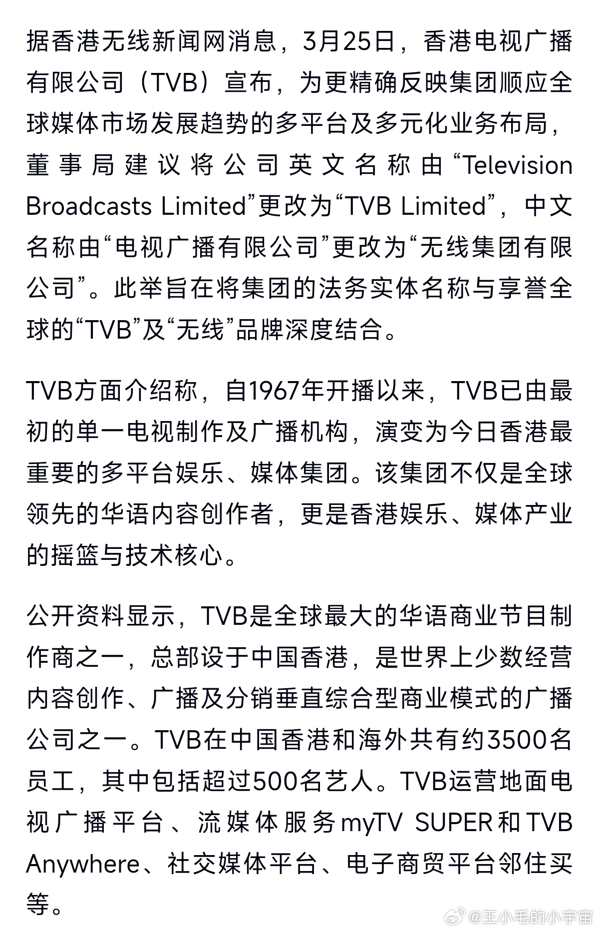 TVB拟更名!据TVB新闻网消息,3月25日香港电视广播有限公司(TVB)宣布拟