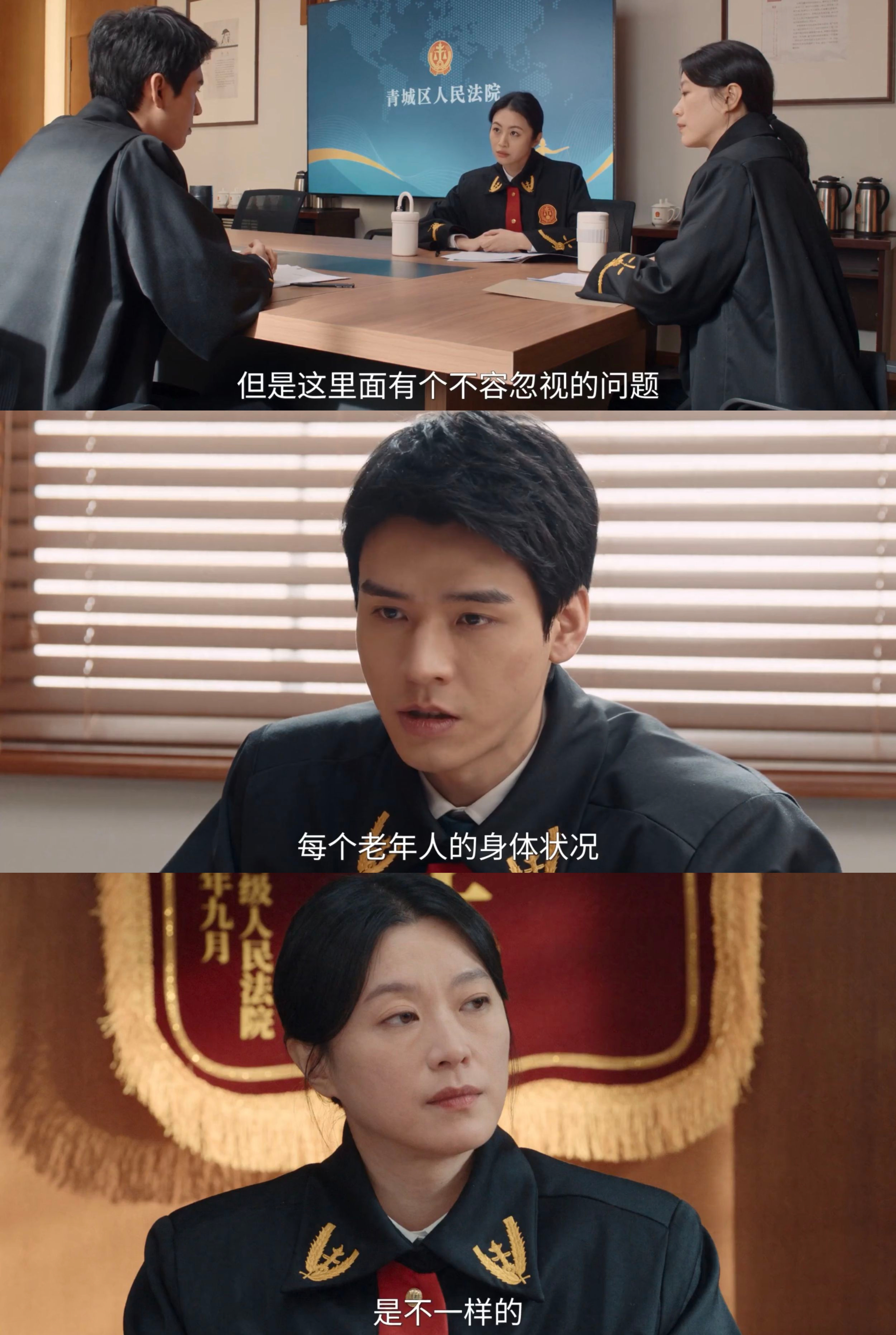 但,这绝不是一蹴而就的,否则沈谢秩的改变太容易,一来不可信,二来人设会崩!沈谢秩的理性依旧是占上风的,在小笼包的问题上,他的理性让他不能忽视小笼包奶奶的身体状况;他的理性与舒静、余乐的感性一道,成为最终判决的支撑,一个家事庭,应该有理性有感性,这是没错的,但对于一名家事庭的法官,如果理性太强,会遮挡住很多感性的东西,沈谢秩的问题正在于此,这也是“三堂会审”的指向。
