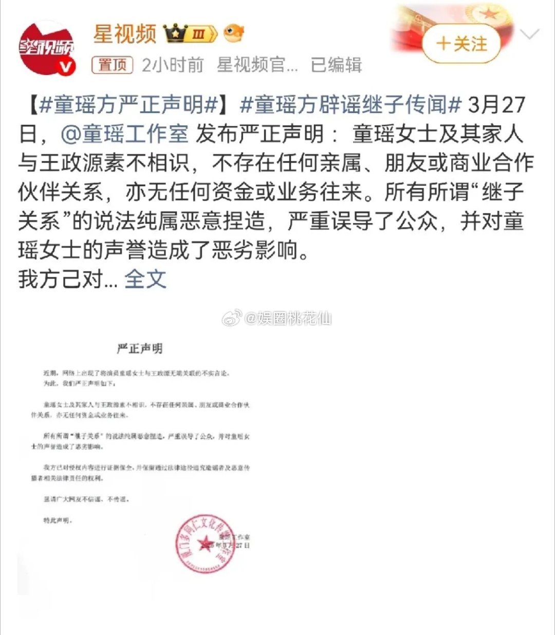 童谣忍无可忍!正式辟谣“继子”谣言3月27日下午,童谣工作室突然发文,态度严肃愤怒,直接回应近期不实谣言。起因是假“京圈富少”王政源,为包装人设恶意造谣,称自己是童谣丈夫王冉的儿子、童谣的继子,靠着这份虚假人脉四处忽悠,随着他非法荐股入狱,这则谣言也越传越广。童谣无辜被牵连,口碑与声誉都受影响。工作室明确表态:童谣及家人与王政源素不相识,无任何亲属、朋友、商业合作关系,更无资金往来,继子说法纯属恶意捏造。目前工作室已做好证据保全,将依法追究造谣及恶意传播者责任,同时呼吁大家不信谣不传谣。其实警方早前就已核实双方无关联,这次正式辟谣,也是彻底终结这场无妄之灾,被凭空蹭热度造谣,换谁都忍不了。