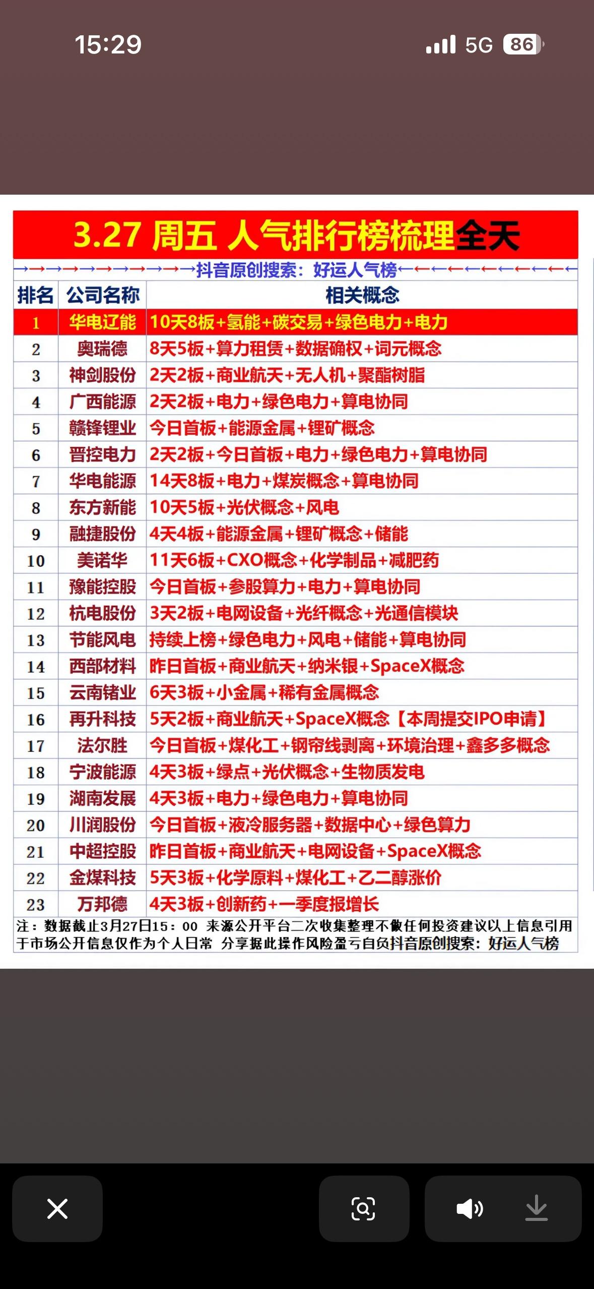 3月27日周五热议人气榜揭晓!📈📈📈"绿电与算力概念股领涨,锂矿、商