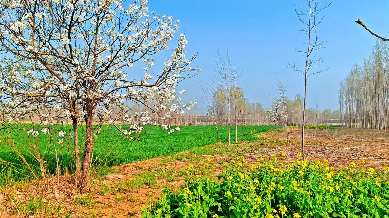 漫步郊外,春风和畅,看着绿油油的麦苗和各种盛开的鲜花,令人心旷神怡! 春天的美景图